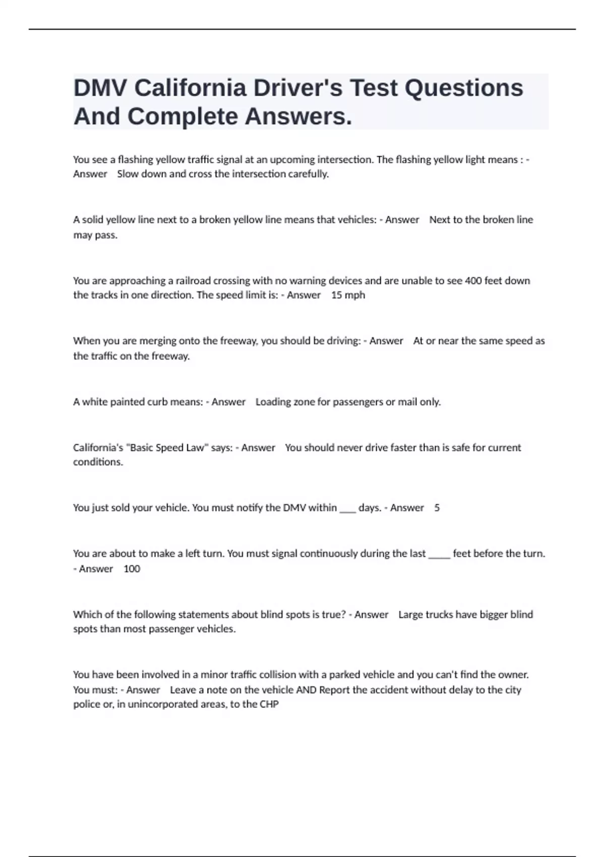 DMV California Driver's Test Questions And Complete Answers.