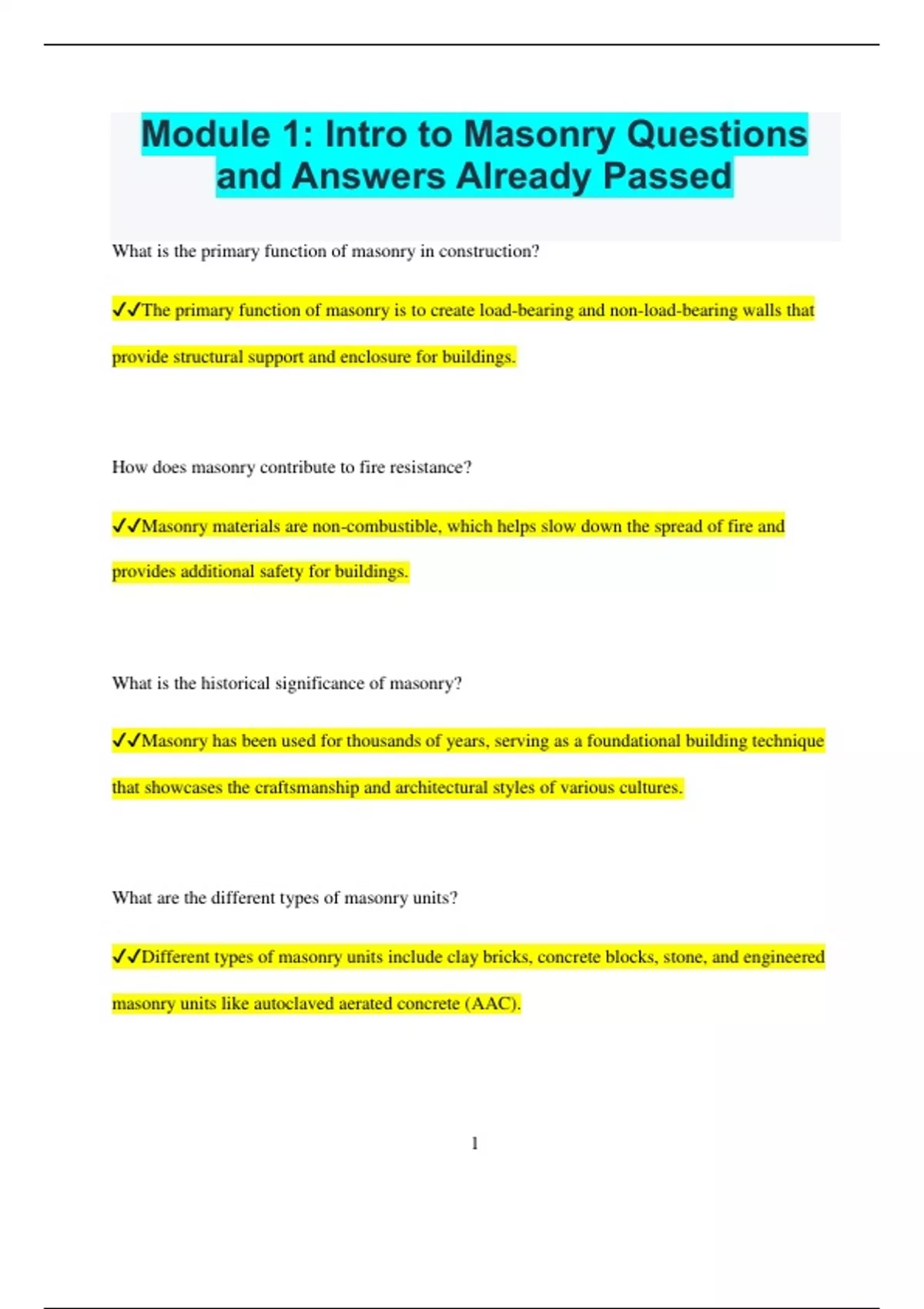 ✔✔The primary function of masonry is to create load-bearing and non-load-bearing walls that