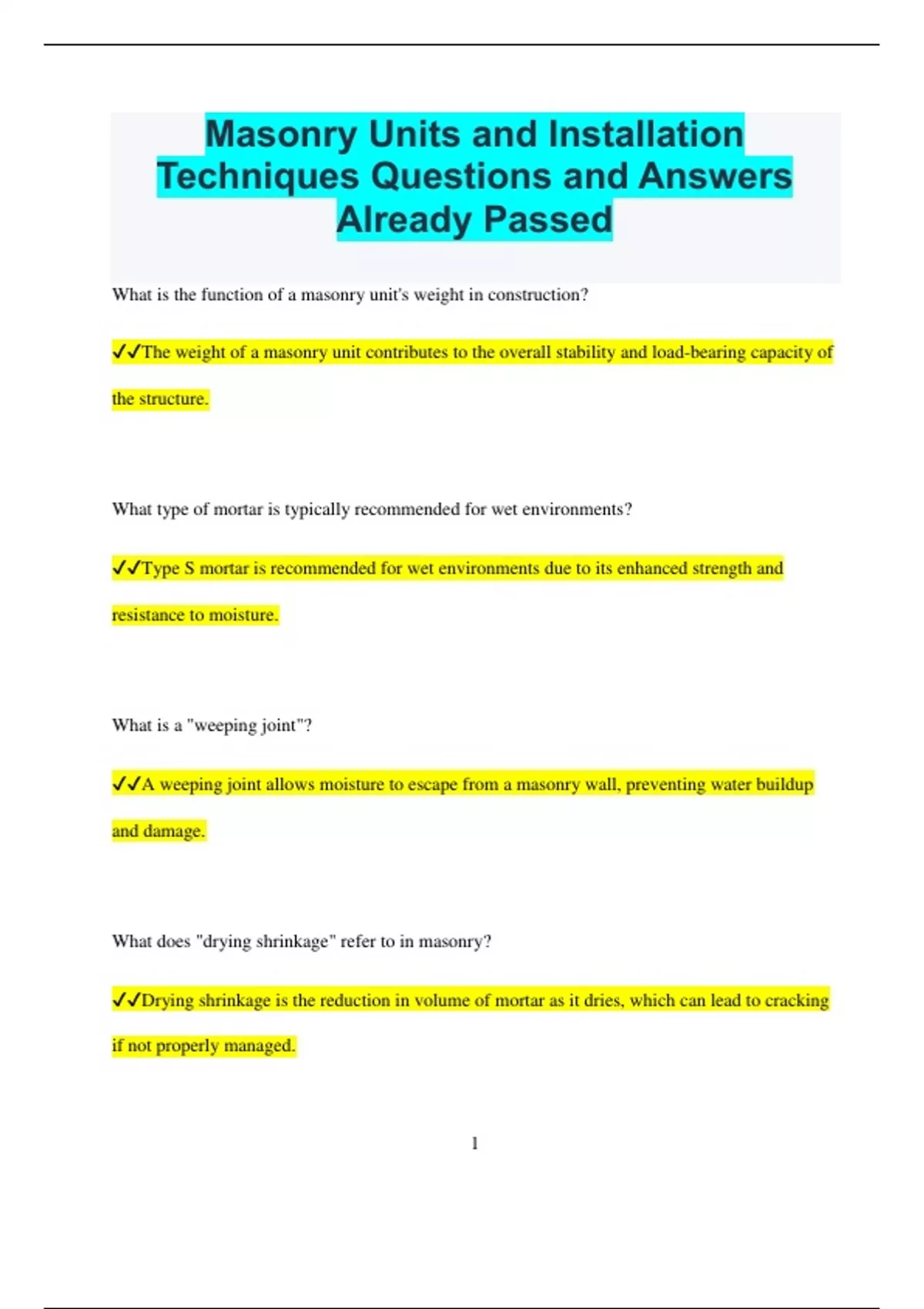 Masonry Units and Installation Techniques Questions and Answers Already Passed