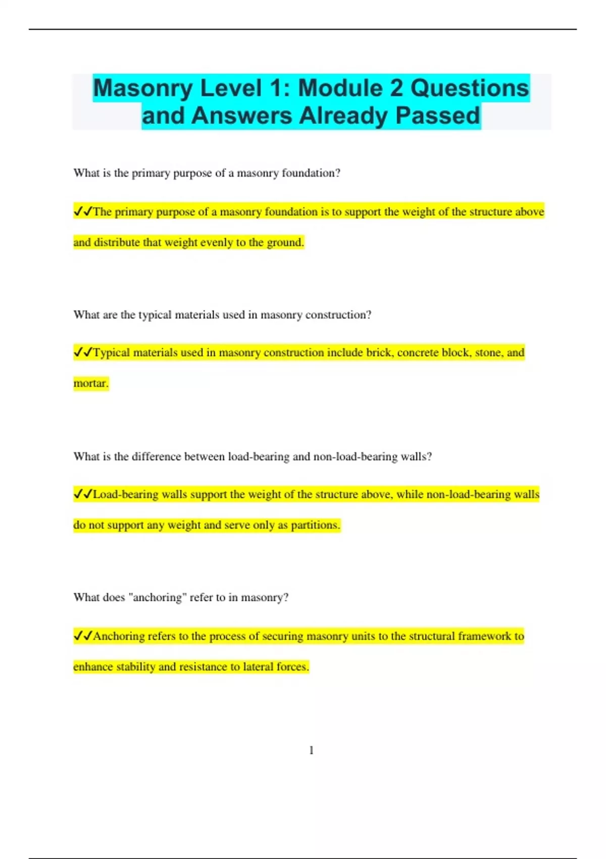 Masonry Level 1: Module 2 Questions and Answers Already Passed