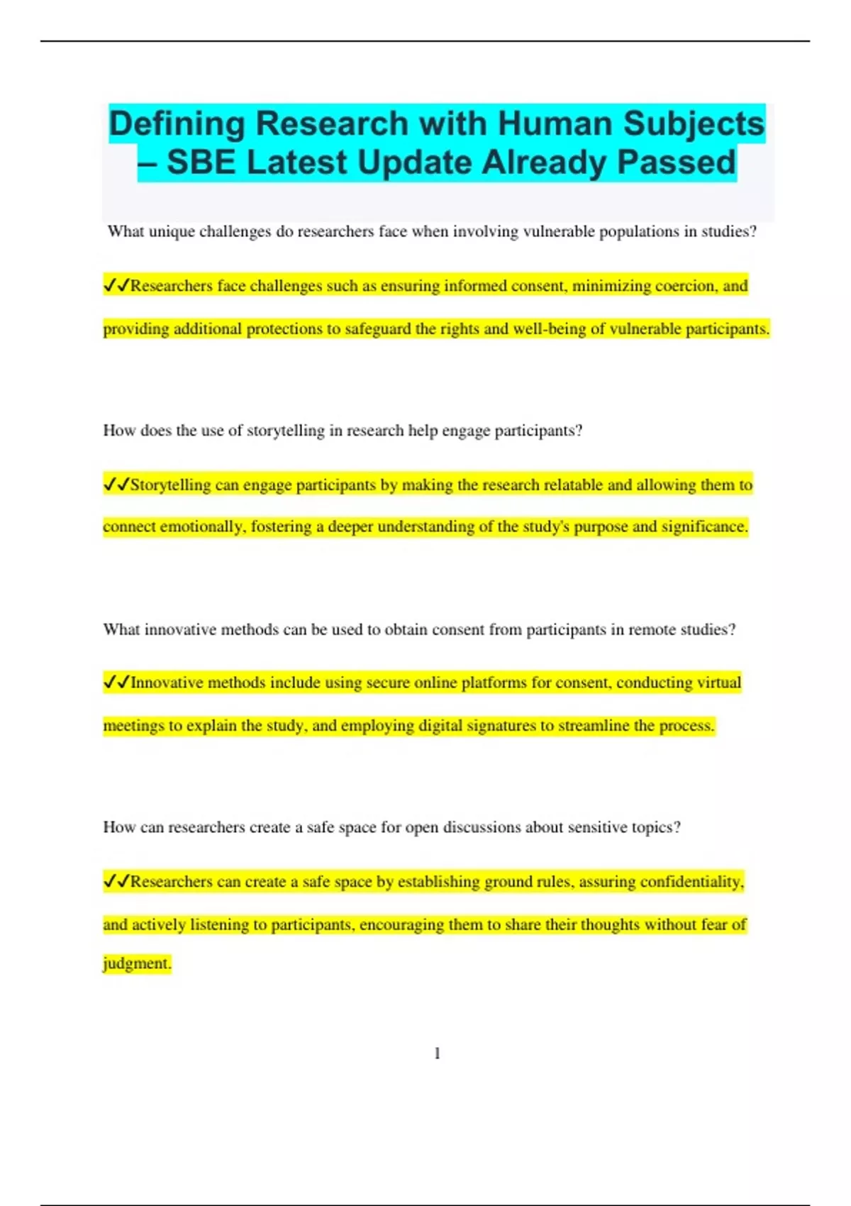 Defining Research with Human Subjects – SBE Latest Update Already Passed What unique challenges do researchers face when involving vulnerable populations in studies? Researchers face challenges such as ensuring informed consent, minimizing coercion, and providing additional protections to safeguard the rights and well-being of vulnerable participants. How does the use of storytelling in research help engage participants? Storytelling can engage participants by making the research relatable and allowing them to connect emotionally, fostering a deeper understanding of the study's purpose and significance. What innovative methods can be used to obtain consent from participants in remote studies? Innovative methods include using secure online platforms for consent, conducting virtual meetings to explain the study, and employing digital signatures to streamline the process. How can researchers create a safe space for open discussions about sensitive topics? Researchers can create a safe space by establishing ground rules, assuring confidentiality, and actively listening to participants, encouraging them to share their thoughts without fear of judgment. 2 What are some unexpected benefits of participant engagement in the research process? Unexpected benefits include gaining diverse perspectives that enrich the study, fostering community trust, and encouraging participants to become advocates for research findings. How can visual aids enhance understanding and retention of informed consent information? Visual aids such as infographics, charts, and videos can enhance understanding by presenting complex information in a more digestible and memorable format for participants. What role does participant autonomy play in the ethical conduct of research? Participant autonomy is fundamental to ethical research, as it respects individuals' rights to make their own decisions regarding participation, based on their values and preferences. How can humor be effectively integrated into research discussions to ease tension? Humor can be integrated carefully to break the ice and create a relaxed atmosphere, helping participants feel more comfortable and willing to engage openly. In what ways can gamification improve participant recruitment and retention? Gamification can improve recruitment and retention by making participation enjoyable through rewards, challenges, and interactive elements that enhance the overall experience. 3 What strategies can researchers employ to foster trust between themselves and participants? Researchers can foster trust by being transparent about the study’s goals, maintaining open communication, and consistently respecting participants' privacy and confidentiality. How can the involvement of community