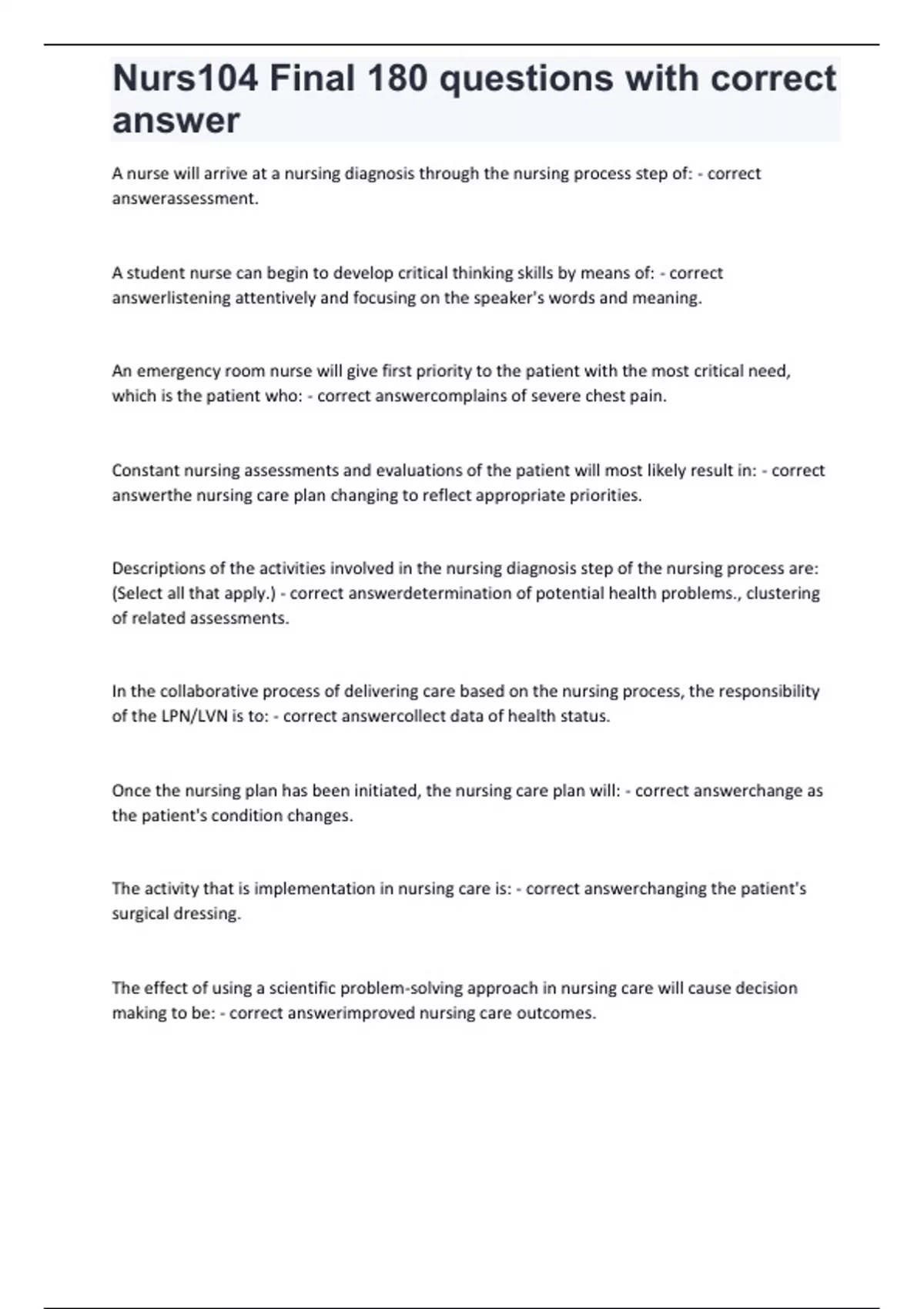 ,Nurs104 Final 180 questions with correct