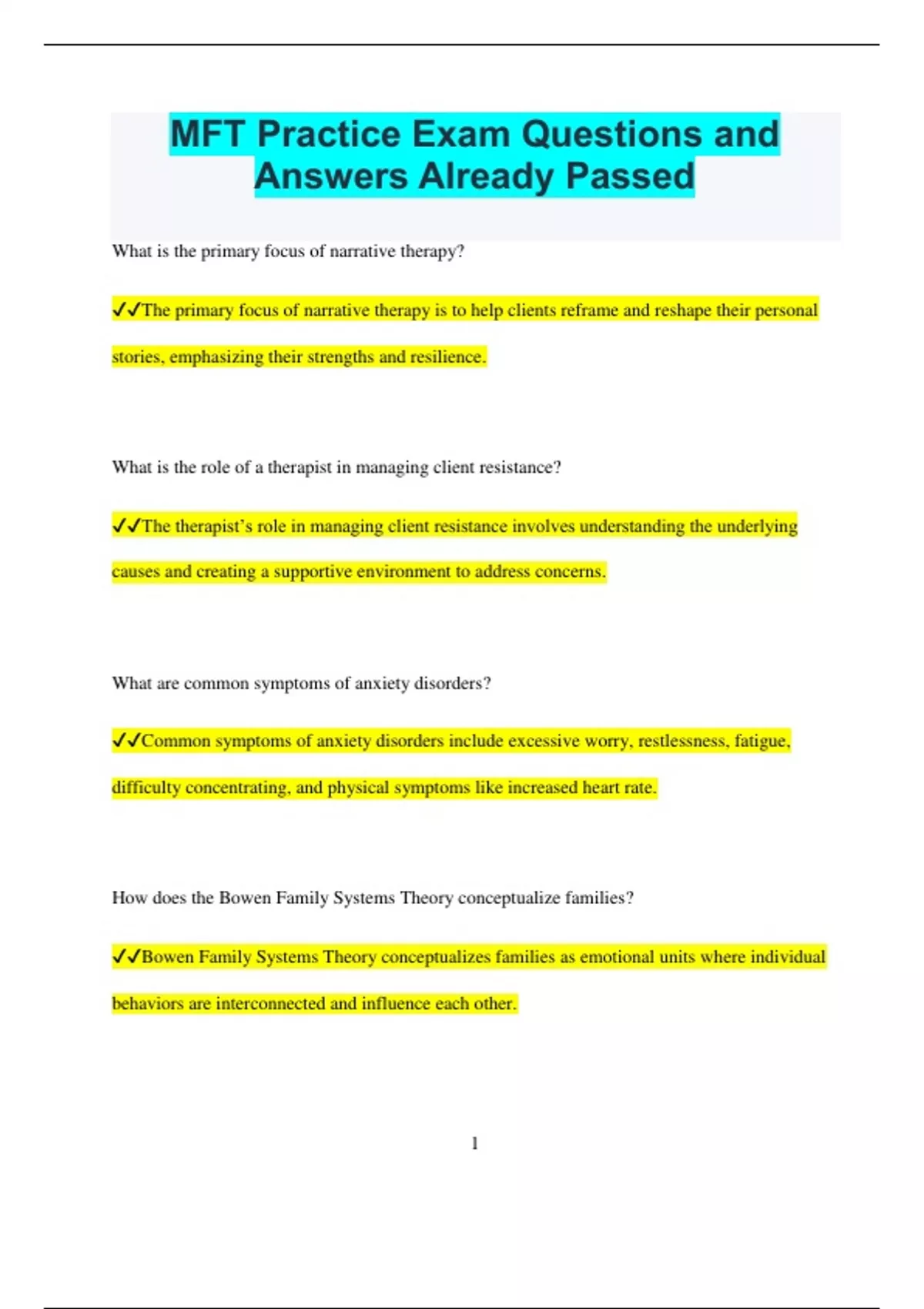 MFT Practice Exam Questions and Answers Already Passed What is the primary focus of narrative therapy? The primary focus of narrative therapy is to help clients reframe and reshape their personal stories, emphasizing their strengths and resilience. What is the role of a therapist in managing client resistance? The therapist’s role in managing client resistance involves understanding the underlying causes and creating a supportive environment to address concerns. What are common symptoms of anxiety disorders? Common symptoms of anxiety disorders include excessive worry, restlessness, fatigue, difficulty concentrating, and physical symptoms like increased heart rate. How does the Bowen Family Systems Theory conceptualize families? Bowen Family Systems Theory conceptualizes families as emotional units where individual behaviors are interconnected and influence each other. 2 What is the purpose of conducting a biopsychosocial assessment? The purpose of a biopsychosocial assessment is to evaluate a client's biological, psychological, and social factors to develop a comprehensive treatment plan. What does the term “cognitive distortions” refer to? Cognitive distortions refer to irrational or exaggerated thought patterns that can negatively impact a person's emotions and behaviors. What is the significance of play therapy in child therapy? Play therapy is significant because it provides children with a natural medium to express feelings and process experiences through play. How does exposure therapy help with phobias? Exposure therapy helps with phobias by gradually exposing individuals to their fears in a safe environment to reduce anxiety over time. What is the concept of “emotional regulation” in therapy? Emotional regulation refers to the ability to manage and respond to emotional experiences in a healthy and adaptive way. 3 What techniques are commonly used in cognitive-behavioral therapy? Common techniques in cognitive-behavioral therapy include cognitive restructuring, behavioral activation, and skills training. What is the purpose of using a genogram in therapy? A genogram is used to visualize family relationships and patterns, helping therapists understand family dynamics and history. How can therapists facilitate effective communication in couples therapy? Therapists can facilitate effective communication in couples therapy by teaching active listening skills and encouraging open, honest dialogue. What is the role of self-disclosure in therapy?