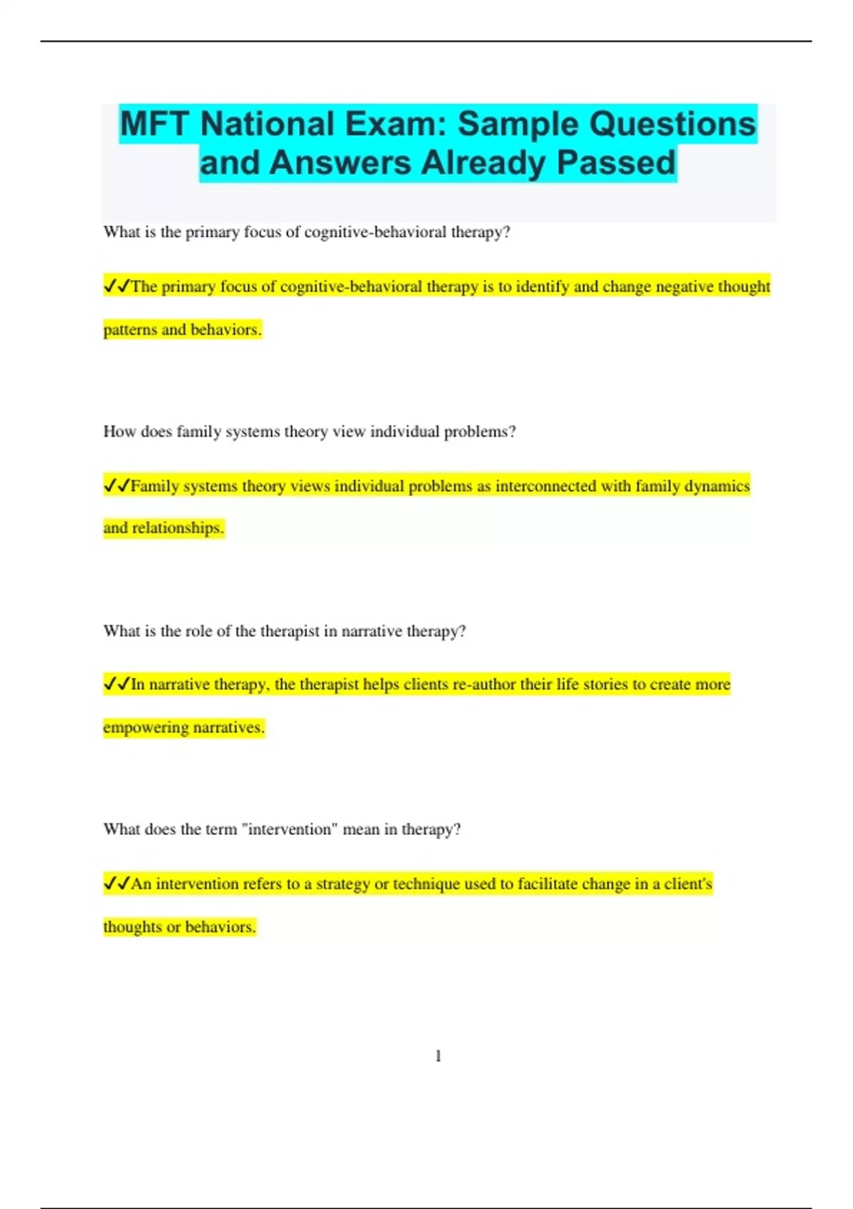 MFT National Exam: Sample Questions and Answers Already Passed What is the primary focus of cognitive-behavioral therapy? The primary focus of cognitive-behavioral therapy is to identify and change negative thought patterns and behaviors. How does family systems theory view individual problems? Family systems theory views individual problems as interconnected with family dynamics and relationships. What is the role of the therapist in narrative therapy? In narrative therapy, the therapist helps clients re-author their life stories to create more empowering narratives. What does the term "intervention" mean in therapy? An intervention refers to a strategy or technique used to facilitate change in a client's thoughts or behaviors. 2 What is the significance of establishing rapport with clients? Establishing rapport builds trust and creates a safe environment for clients to explore their feelings. What does "circular questioning" involve in family therapy? Circular questioning involves asking family members about their perceptions of each other's behaviors and feelings. What is the aim of solution-focused brief therapy? The aim of solution-focused brief therapy is to focus on solutions rather than problems, emphasizing client strengths. How is attachment theory relevant in family therapy? Attachment theory is relevant as it helps understand the emotional bonds between family members and their impact on relationships. What are some common ethical considerations in therapy? Common ethical considerations include confidentiality, informed consent, and maintaining professional boundaries. 3 How does the concept of differentiation apply to family dynamics? Differentiation involves maintaining one's identity while staying emotionally connected to family members. What is the purpose of using genograms in therapy? Genograms are used to visually map family relationships and patterns, aiding in understanding family dynamics. What is the importance of cultural competence in therapy? Cultural competence ensures that therapists are sensitive to and respectful of clients' diverse cultural backgrounds. How does systemic therapy address client issues? Systemic therapy addresses client issues by examining family dynamics and patterns that contribute to the problems.