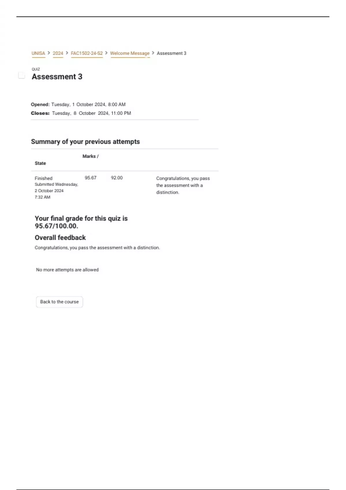 UNISA  2024  FAC1502-24-S2  Welcome Message  Assessment 3