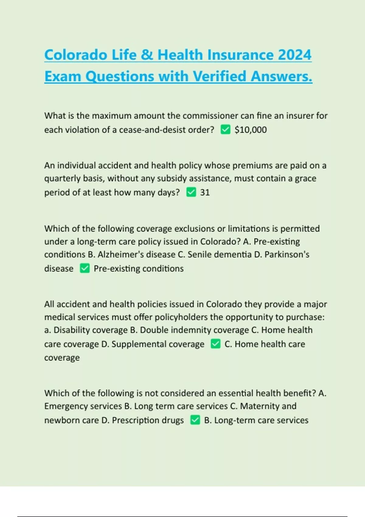 What is the maximum amount the commissioner can fine an insurer for each violation of a cease-and-desist order? $10,000 An individual accident and health policy whose premiums are paid on a quarterly basis, without any subsidy assistance, must contain a grace period of at least how many days? 31 Which of the following coverage exclusions or limitations is permitted under a long-term care policy issued in Colorado? A. Pre-existing conditions B. Alzheimer's disease C. Senile dementia D. Parkinson's disease Pre-existing conditions All accident and health policies issued in Colorado they provide a major medical services must offer policyholders the opportunity to purchase: a. Disability coverage B. Double indemnity coverage C. Home health care coverage D. Supplemental coverage C. Home health care coverage Which of the following is not considered an essential health benefit? A. Emergency services B. Long term care services C. Maternity and newborn care D. Prescription drugs B. Long-term care services
