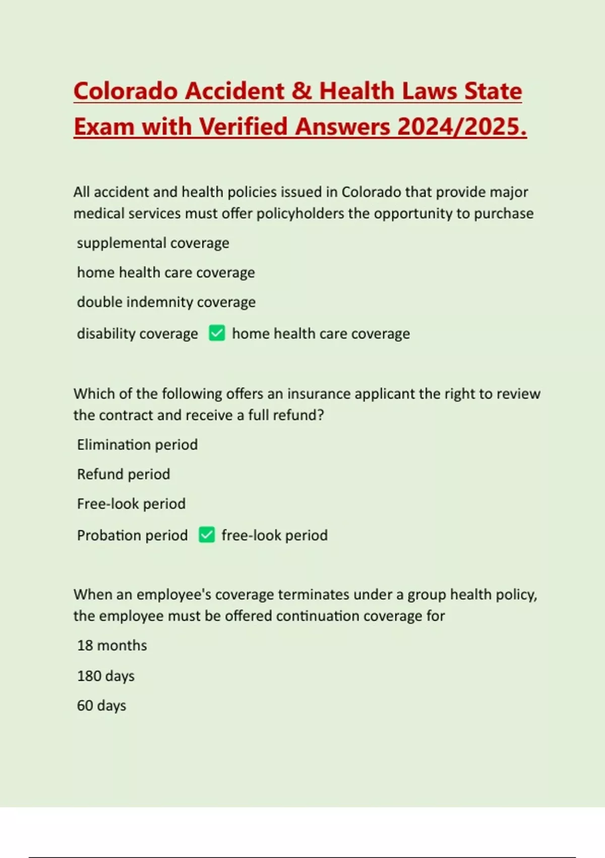 All accident and health policies issued in Colorado that provide major medical services must offer policyholders the opportunity to purchase supplemental coverage home health care coverage double indemnity coverage disability coverage home health care coverage Which of the following offers an insurance applicant the right to review the contract and receive a full refund? Elimination period Refund period Free-look period Probation period free-look period When an employee's coverage terminates under a group health policy, the employee must be offered continuation coverage for 18 months 180 days 60 days 365 days 18 months An producer who violates a cease and desist order may, after a hearing, be fined up to $750 $1000 $500 $250 500