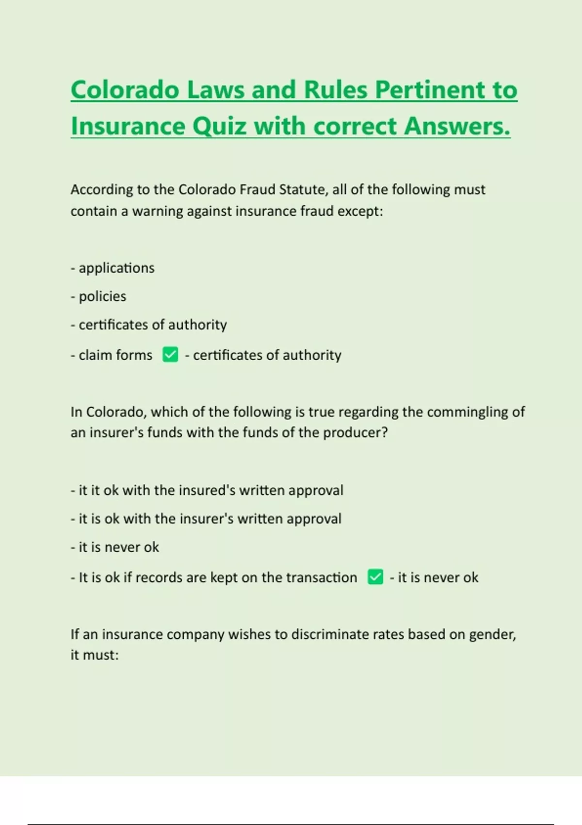 Colorado Laws and Rules Pertinent to Insurance Quiz with correct Answers | Latest 2024/2025