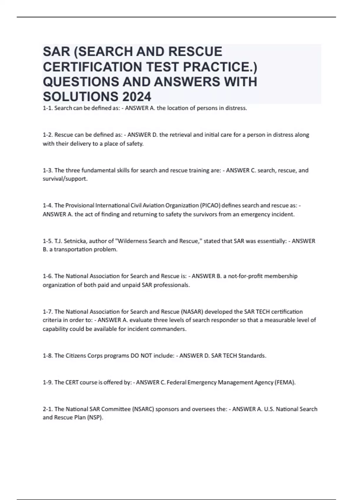 1-6. The National Association for Search and Rescue is: - ANSWER B. a not-for-profit membership
