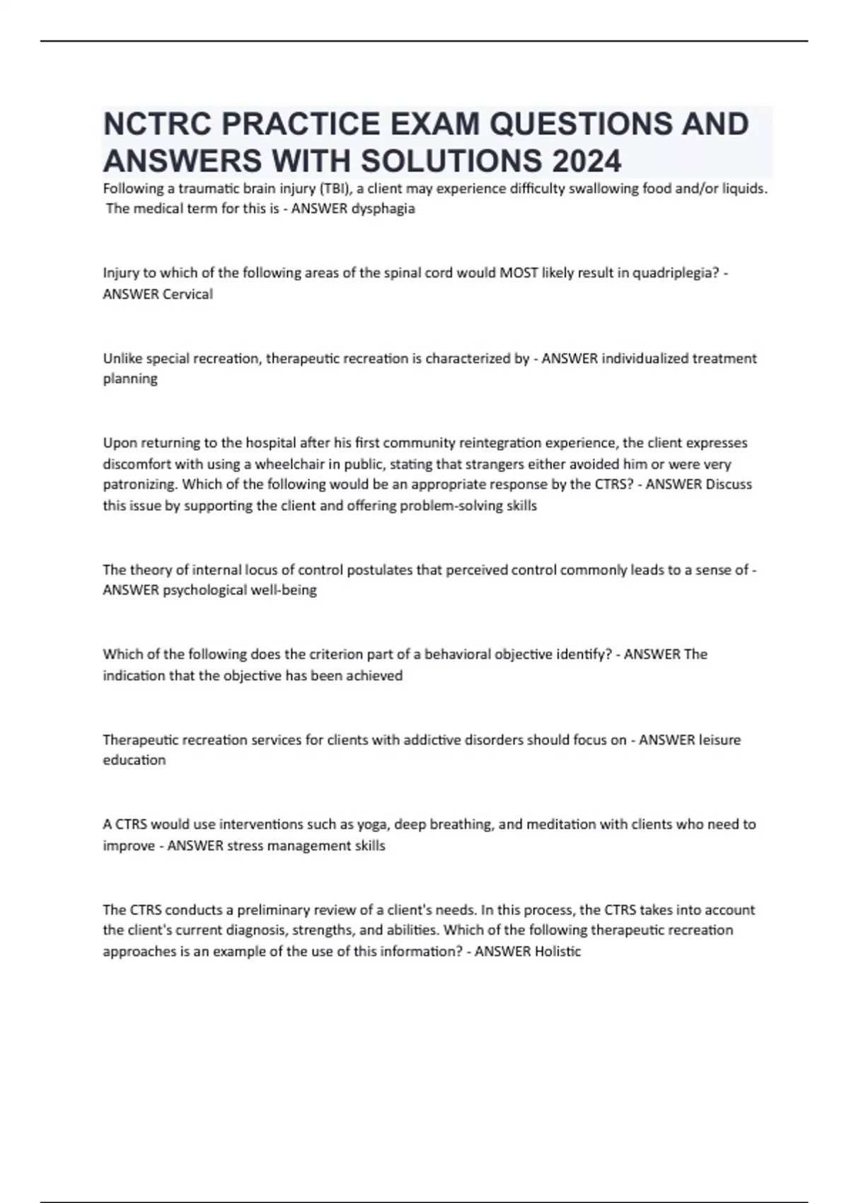 Therapeutic recreation services for clients with addictive disorders should focus on - ANSWER leisure