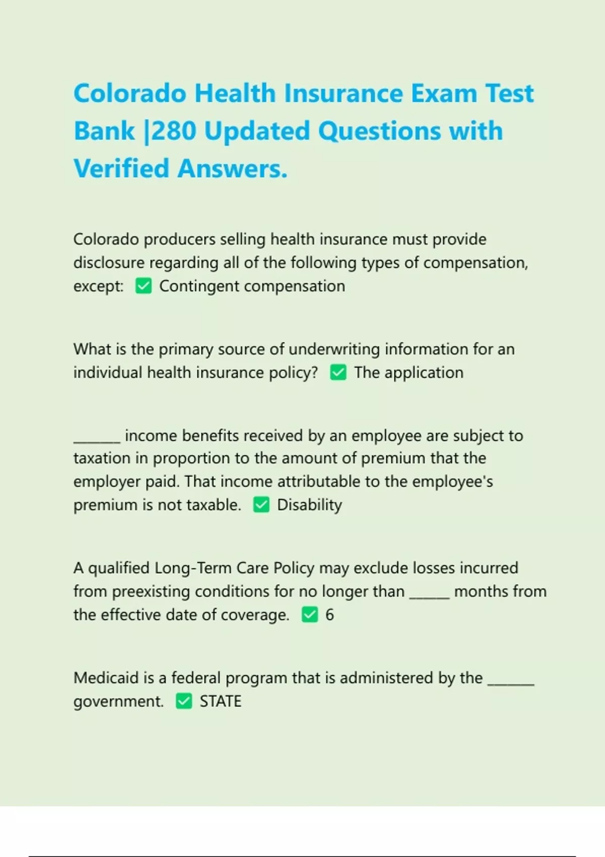 Colorado Health Insurance Exam Test Bank |280 Updated Questions with Verified Answers |Latest 2024/2025