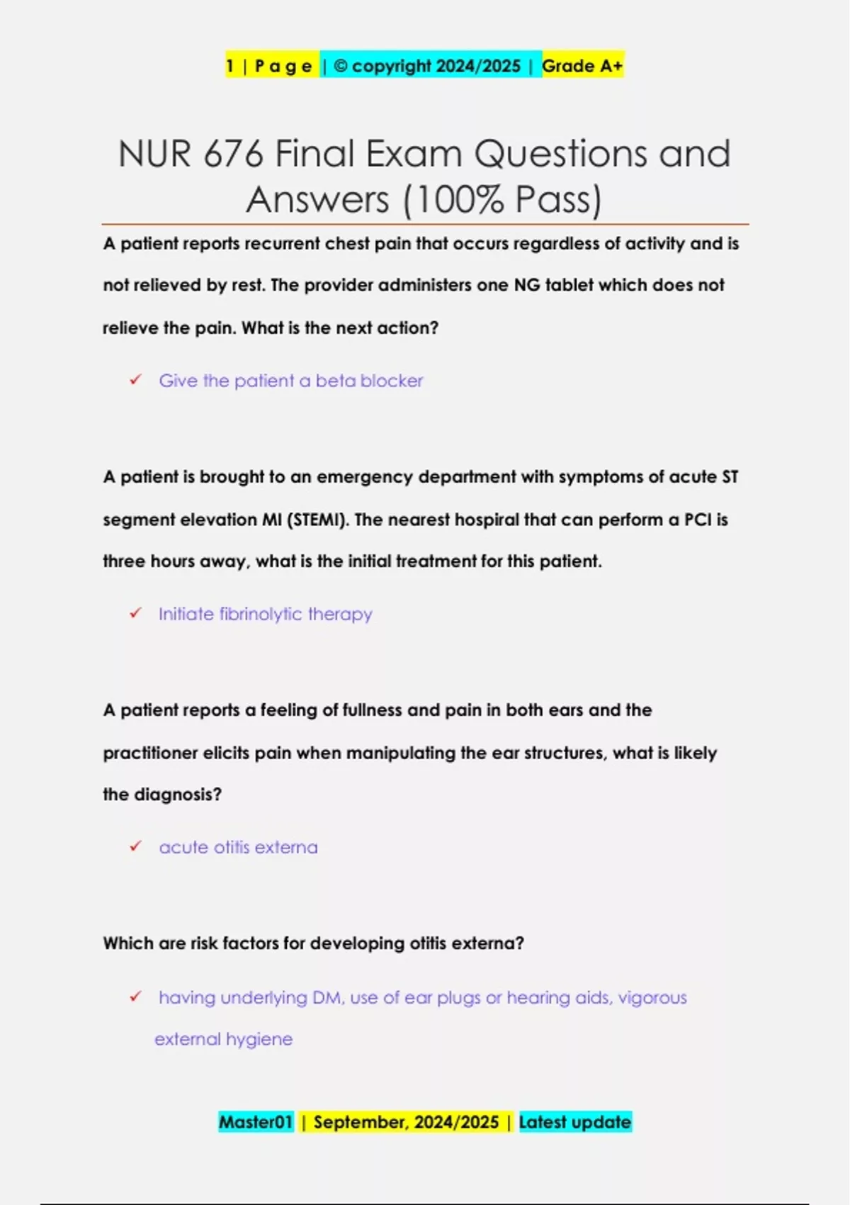 A patient reports recurrent chest pain that occurs regardless of activity and is not relieved by rest. The provider administers one NG tablet which does not relieve the pain. What is the next action? Give the patient a beta blocker A patient is brought to an emergency department with symptoms of acute ST segment elevation MI (STEMI). The nearest hospiral that can perform a PCI is three hours away, what is the initial treatment for this patient. Initiate fibrinolytic therapy A patient reports a feeling of fullness and pain in both ears and the practitioner elicits pain when manipulating the ear structures, what is likely the diagnosis? acute otitis externa Which are risk factors for developing otitis externa? having underlying DM, use of ear plugs or hearing aids, vigorous external hygiene Master01 | September, 2024/2025 | Latest update 1 | P a g e | © copyright 2024/2025 | Grade A+ A patient has an initial episode of otitis external associated with swimming. the patient's ear canal is mildly inflamed and the TM is not involved. Which medication will be ordered? Cipro HC Which symptoms in children are evlauated using a parent-reported scoring system to determine the severity of pain in children with OM? Appetite, Difficulty sleeping, and tugging on ears. Which patient may be given symptomatic treatment with 24 hours follow-up assessment without initial antibiotic therapy? A 36 month old with fever of 38.5, mild otalgia, and red, non-bulging TM A pediatric patien