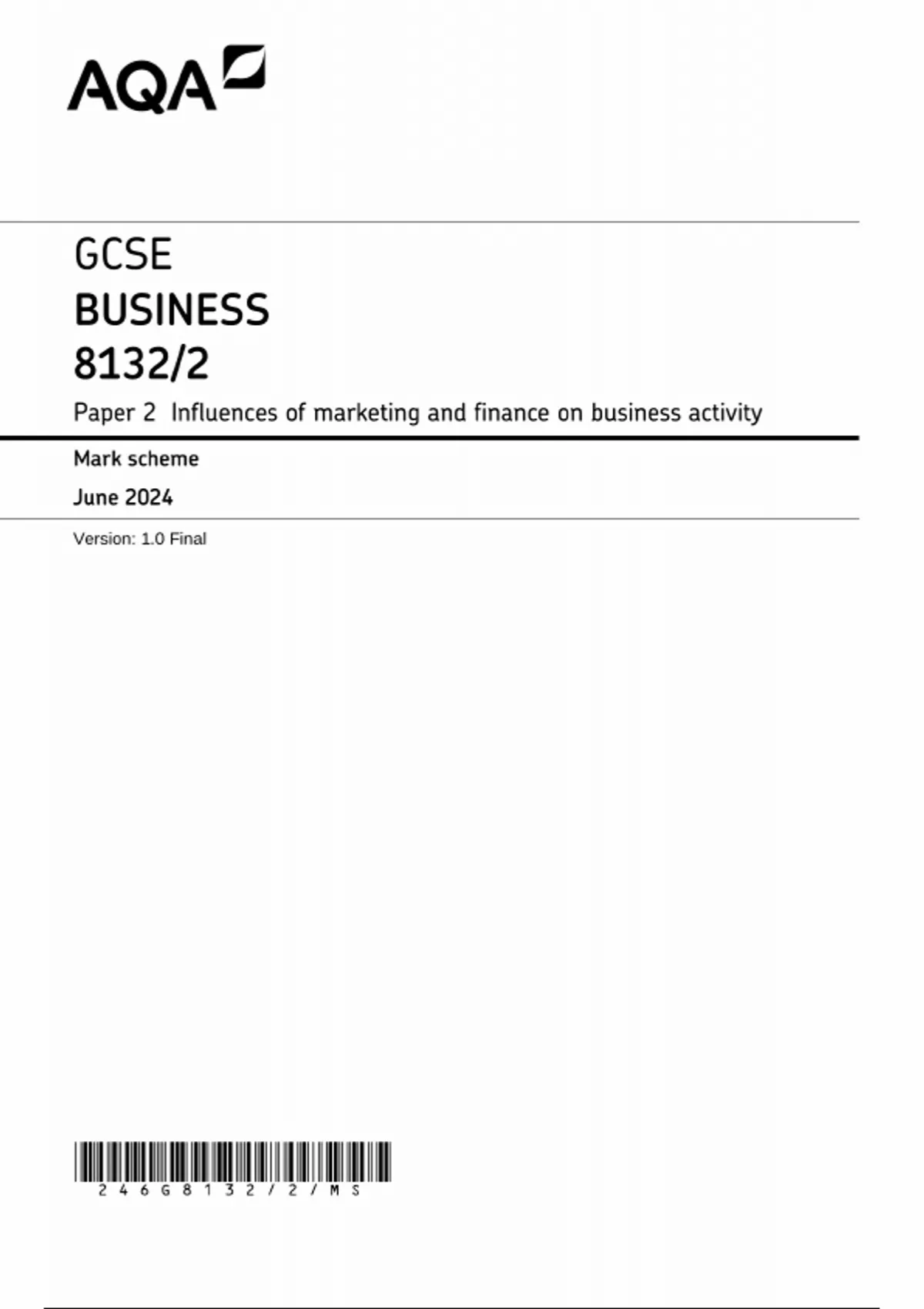 AQA GCSE BUSINESS Paper 2 (8132/2: Influences of marketing and finance on business activity ,Mark scheme 2024