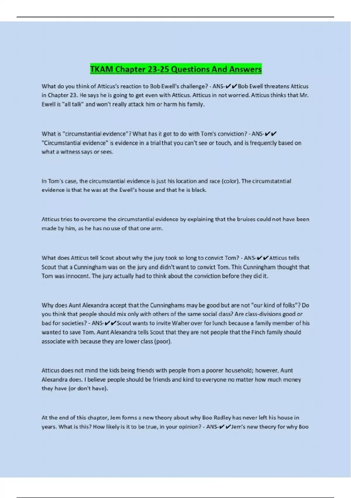 TKAM Chapter 23-25 Questions And Answers What do you think of Atticus's reaction to Bob Ewell's challenge? - ANS-Bob Ewell threatens Atticus in Chapter 23. He says he is going to get even with Atticus. Atticus in not worried. Atticus thinks that Mr. Ewell is "all talk" and won't really attack him or harm his family. What is "circumstantial evidence"? What has it got to do with Tom's conviction? - ANS- "Circumstantial evidence" is evidence in a trial that you can't see or touch, and is frequently based on what a witness says or sees. In Tom's case, the circumstantial evidence is just his location and race (color). The circumstatntial evidence is that he was at the Ewell's house and that he is black. Atticus tries to overcome the circumstantial evidence by explaining that the bruises could not have been made by him, as he has no use of that one arm. What does Atticus tell Scout about why the jury took so long to convict Tom? - ANS-Atticus tells Scout that a Cunningham was on the jury and didn't want to convict Tom. This Cunningham thought that Tom was innocent. The jury actually had to think about the conviction before they did it. Why does Aunt Alexandra accept that the Cunninghams may be good but are not "our kind of folks"? Do you think that people should mix only with others of the same social class? Are class-divisions good or bad for societies? - ANS-Scout wants to invite Walter over for lunch because a family member of his wanted to save Tom. Aunt Alexandra tells Scout that they are not people that the Finch family should associate with because they are lower class (poor). Atticus does not mind the kids being friends with people from a poorer household; however, Aunt Alexandra does. I believe people should be friends and kind to everyone no matter how much money they have (or don't have). At the end of this chapter, Jem forms a new theory about why Boo Radley has never left his house in years. What is this? How likely is it to be true, in your opinion? - ANS-