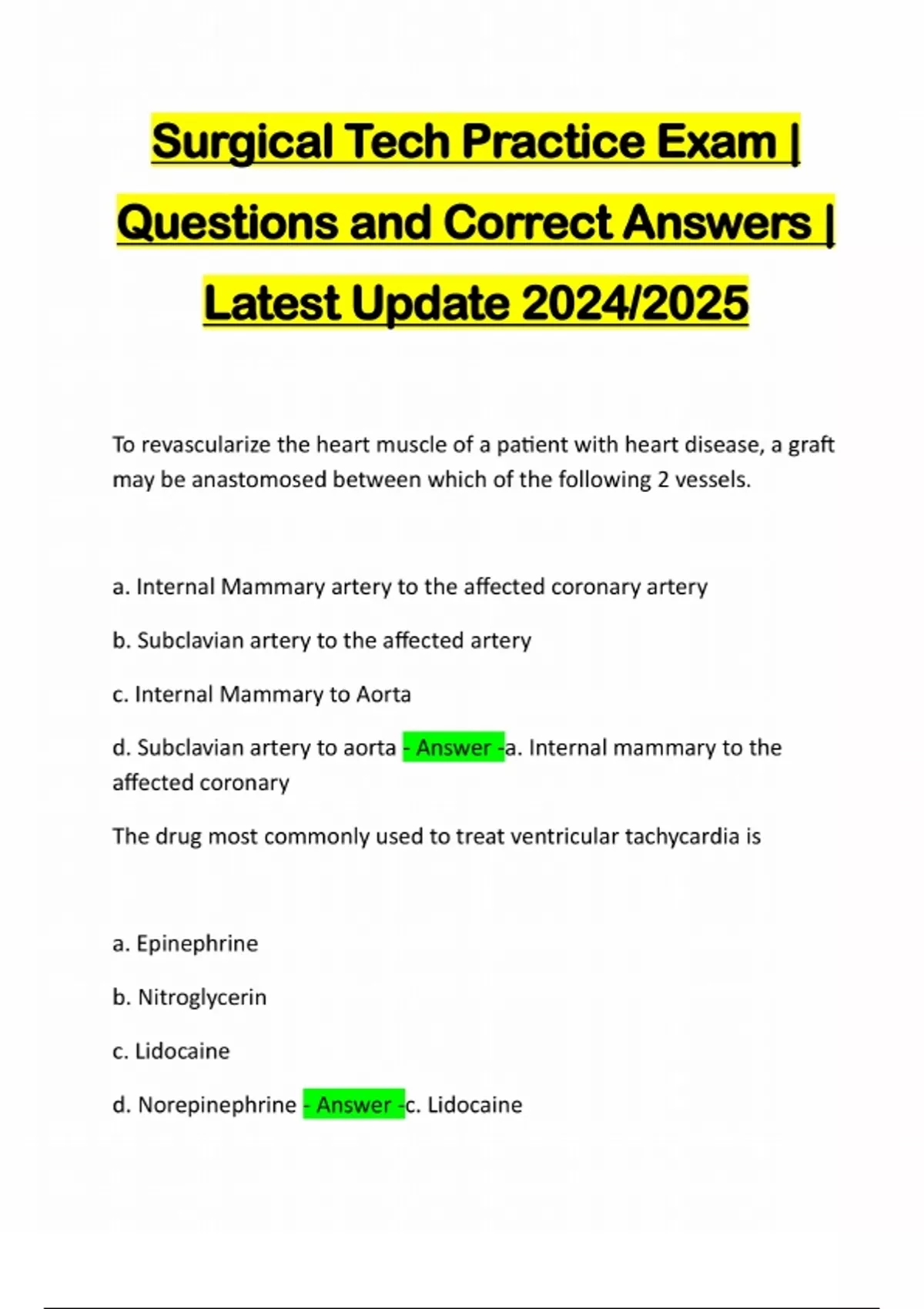Surgical Tech Practice Exam | Questions and Correct Answers | Latest Update 2024/2025 To revascularize the heart muscle of a patient with heart disease, a graft may be anastomosed between which of the following 2 vessels. a. Internal Mammary artery to the affected coronary artery b. Subclavian artery to the affected artery c. Internal Mammary to Aorta d. Subclavian artery to aorta - Answer -a. Internal mammary to the affected coronary The drug most commonly used to treat ventricular tachycardia is a. Epinephrine b. Nitroglycerin c. Lidocaine d. Norepinephrine - Answer -c. LidocaineAn ideal environment for holding the preoperative patient is a a. Dimly lit quiet room b. Brightly lit quiet room c. Warm busy room d. Cool, busy room - Answer -a. Dimly lit quiet room Which of the following procedures treats a congenital obstructed lesion found at the distal end of an infants stomach? a. Gastrotomy b. Nissan Fundoplication C. Heller Myotomy