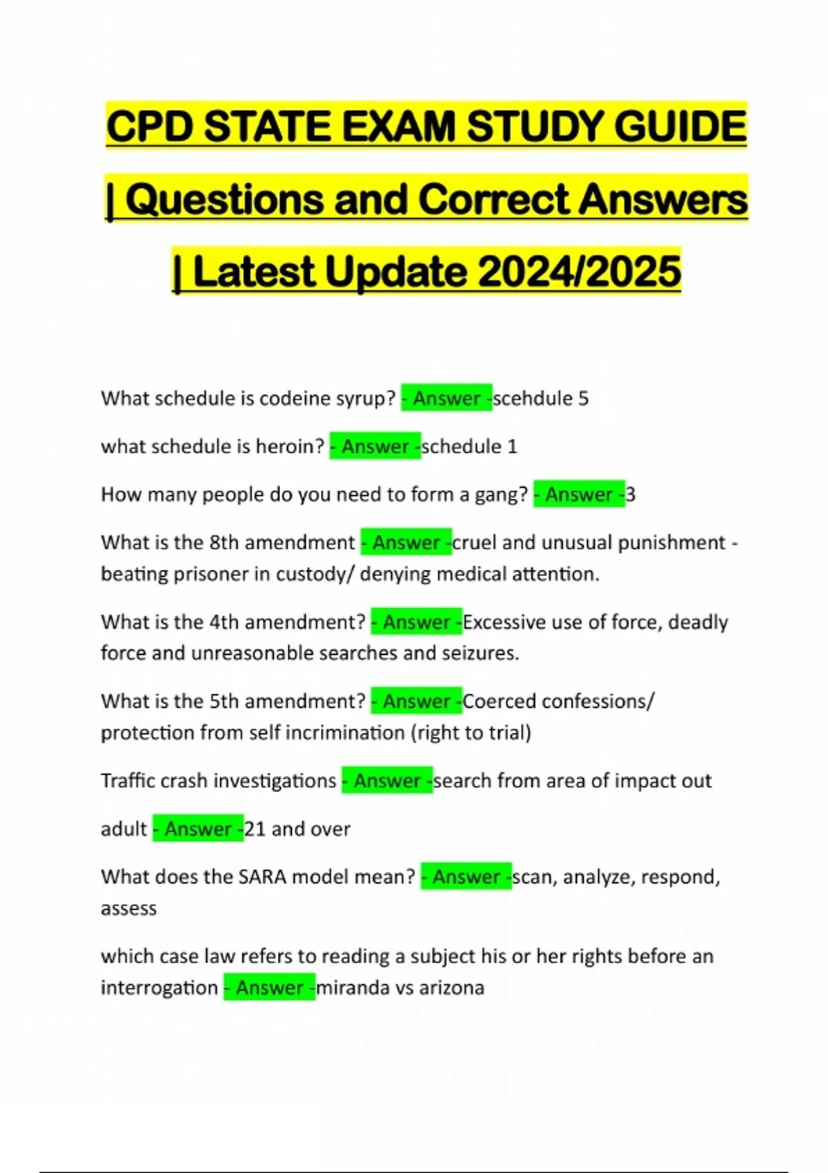 CPD STATE EXAM STUDY GUIDE | Questions and Correct Answers | Latest Update 2024/2025 What schedule is codeine syrup? - Answer -scehdule 5 what schedule is heroin? - Answer -schedule 1 How many people do you need to form a gang? - Answer -3 What is the 8th amendment - Answer -cruel and unusual punishment - beating prisoner in custody/ denying medical attention. What is the 4th amendment? - Answer -Excessive use of force, deadly force and unreasonable searches and seizures. What is the 5th amendment? - Answer -Coerced confessions/ protection from self incrimination (right to trial) Traffic crash investigations - Answer -search from area of impact out adult - Answer -21 and over What does the SARA model mean? - Answer -scan, analyze, respond, assess which case law refers to reading a subject his or her rights before an interrogation - Answer -miranda vs arizonawhat schedule is barbiturates? - Answer -schedule 2 theft valued over 500$ - Answer -felony theft if a family member strangles someone during a domestic incident what is it considered - Answer -aggravated domestic battery do you patronize a person with mental health - Answer -N