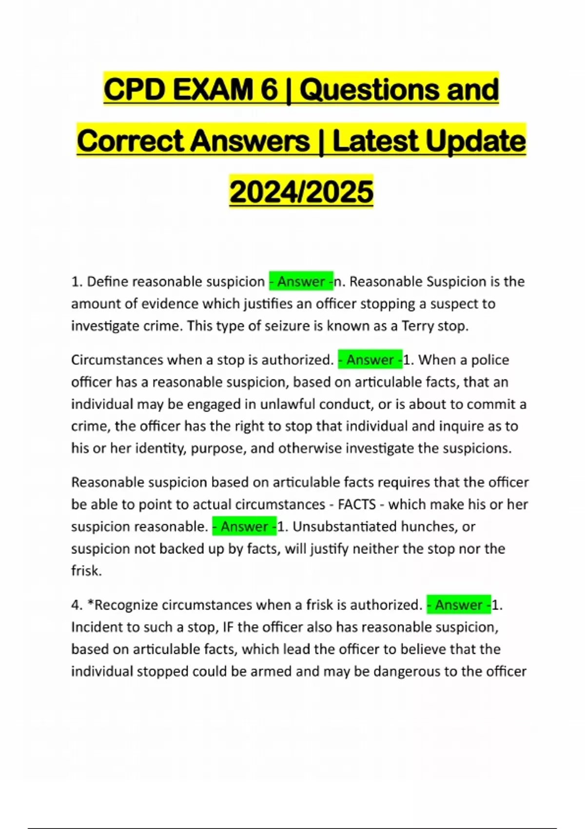 CPD EXAM 6 | Questions and Correct Answers | Latest Update 2024/2025 1. Define reasonable suspicion - Answer -n. Reasonable Suspicion is the amount of evidence which justifies an officer stopping a suspect to investigate crime. This type of seizure is known as a Terry stop. Circumstances when a stop is authorized. - Answer -1. When a police officer has a reasonable suspicion, based on articulable facts, that an individual may be engaged in unlawful conduct, or is about to commit a crime, the officer has the right to stop that individual and inquire as to his or her identity, purpose, and otherwise investigate the suspicions. Reasonable suspicion based on articulable facts requires that the officer be able to point to actual circumstances - FACTS - which make his or her suspicion reasonable. - Answer -1. Unsubstantiated hunches, or suspicion not backed up by facts, will justify neither the stop nor the frisk. 4. *Recognize circumstances when a frisk is authorized. - Answer -1. Incident to such a stop, IF the officer also has reasonable suspicion, based on articulable facts, which lead the officer to believe that the individual stopped could be armed and may be dangerous to the officeror to others, the officer may frisk the outer clothing of the person for purpose of determining whether the person is carrying a weapon. Frisk or pat down - Answer -limited search of outer garments for weapons only 1. According to Minnesota v. Dickerson, w