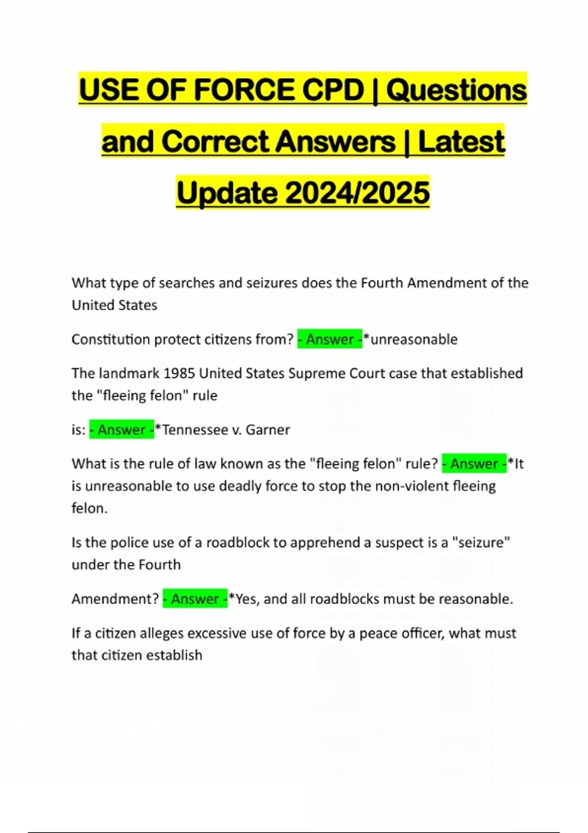 USE OF FORCE CPD | Questions and Correct Answers | Latest Update 2024/2025 What type of searches and seizures does the Fourth Amendment of the United States Constitution protect citizens from? - Answer -*unreasonable The landmark 1985 United States Supreme Court case that established the "fleeing felon" rule is: - Answer -*Tennessee v. Garner What is the rule of law known as the "fleeing felon" rule? - Answer -*It is unreasonable to use deadly force to stop the non-violent fleeing felon. Is the police use of a roadblock to apprehend a suspect is a "seizure" under the Fourth Amendment? - Answer -*Yes, and all roadblocks must be reasonable. If a citizen alleges excessive use of force by a peace officer, what must that citizen establishabout the use of force in order to show the o