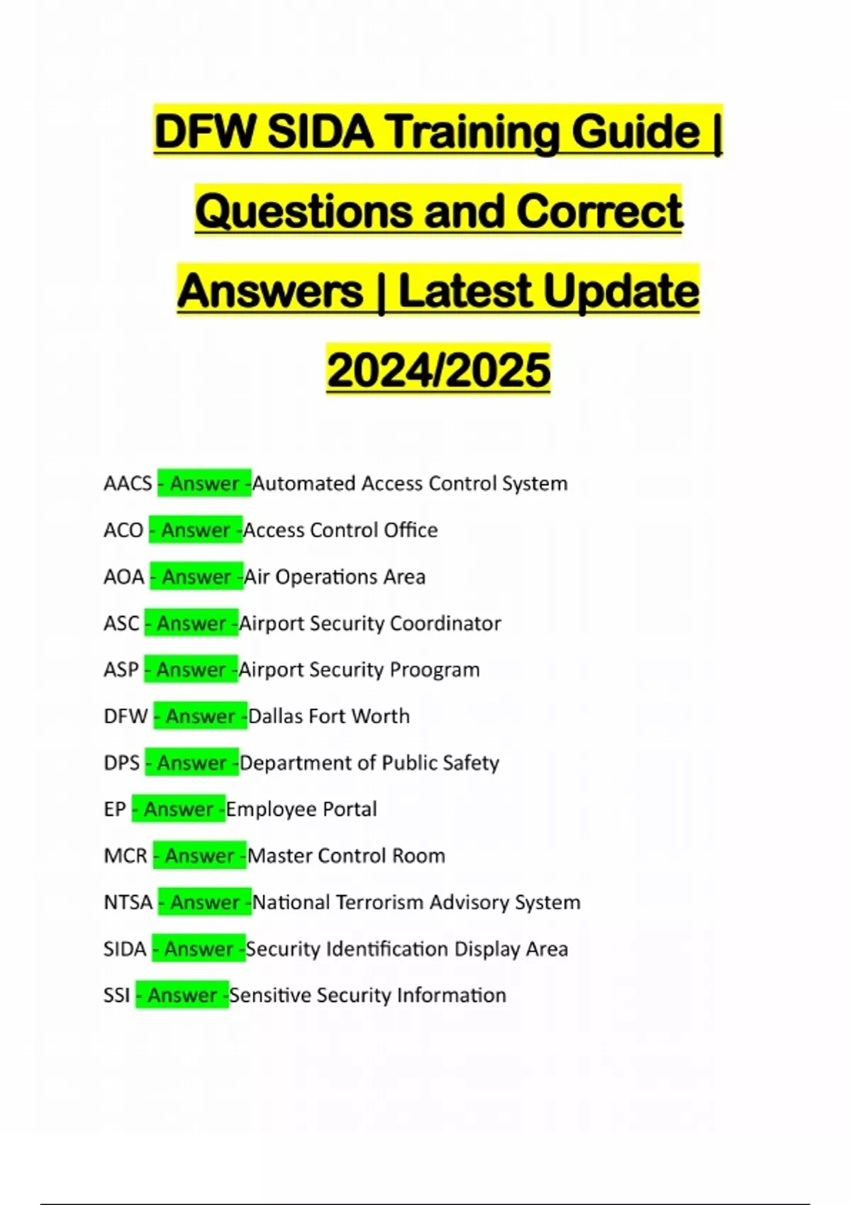 DFW SIDA Training Guide | Questions and Correct Answers | Latest Update 2024/2025 AACS - Answer -Automated Access Control System ACO - Answer -Access Control Office AOA - Answer -Air Operations Area ASC - Answer -Airport Security Coordinator ASP - Answer -Airport Security Proogram DFW - Answer -Dallas Fort Worth DPS - Answer -Department of Public Safety