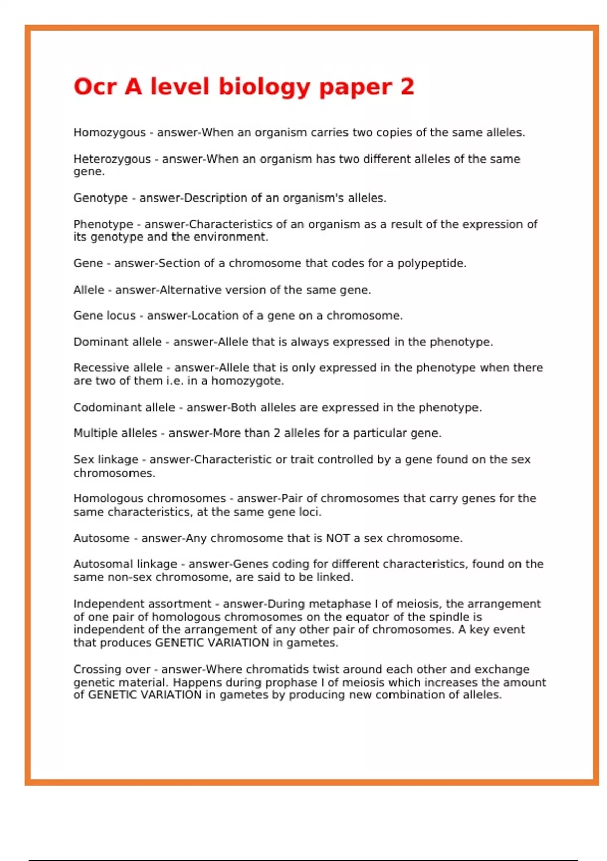 Allele - answer-Alternative version of the same gene.