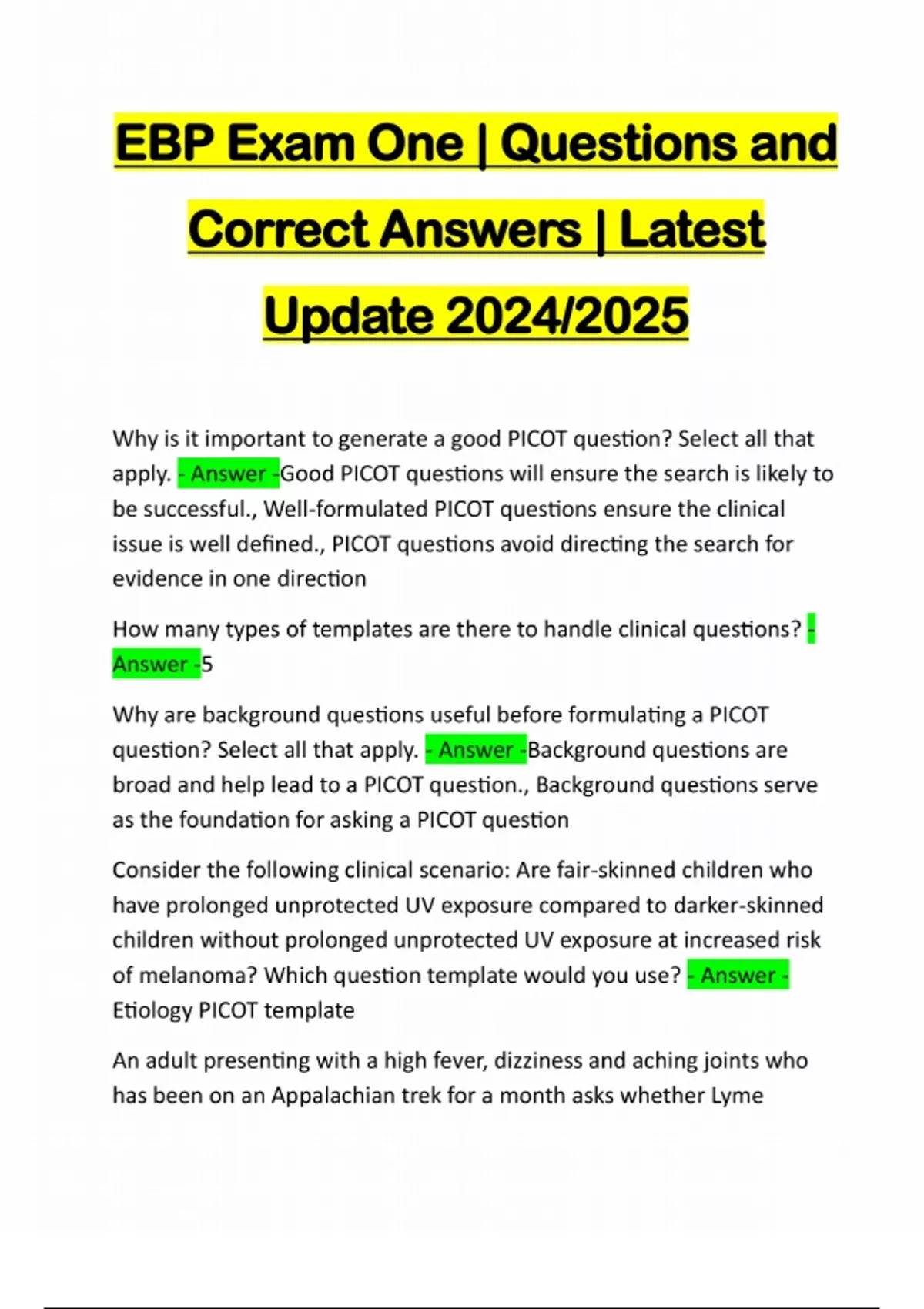 EBP Exam One | Questions and Correct Answers | Latest Update 2024/2025 Why is it important to generate a good PICOT question? Select all that apply. - Answer -Good PICOT questions will ensure the search is likely to be successful., Well-formulated PICOT questions ensure the clinical issue is well defined., PICOT questions avoid directing the search for evidence in one direction How many types of templates are there to handle clinical questions? - Answer -5 Why are background questions useful before formulating a PICOT question? Select all that apply. - Answer -Background questions are broad and help lead to a PICOT question., Background questions serve as the foundation for asking a PICOT question Consider the following clinical scenario: Are fair-skinned children who have prolonged unprotected UV exposure compared to darker-skinned children without prolonged unprotected UV exposure at increased risk of melanoma? Which question template would you use? - Answer - Etiology PICOT template An adult presenting with a high fever, dizziness and aching joints who has been on an Appalachian trek for a month asks whether Lymedisease is a possible cause of the symptoms they are now experiencing. The provider wonders if running an enzy