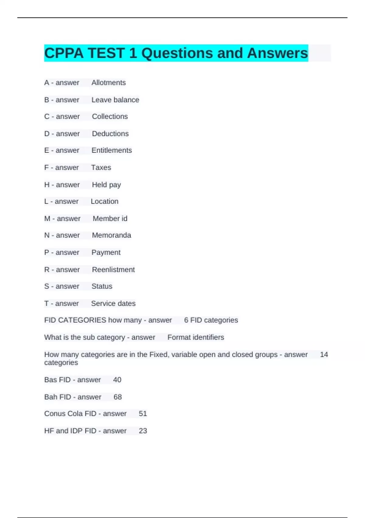 CPPA TEST 1 Questions and Answers A Allotments B Leave balance Previous Play Next Rewind 10 seconds Move forward 10 seconds Unmute 0:11 / 0:15 Full screen Brainpower Read More C Collections D Deductions E Entitlements F Taxes H Held pay L Location M Member id N Memoranda P Payment R Reenlistment S Status T Service dates FID CATEGORIES how many 6 FID categories What is the sub category Format identifiers How many categories are in the Fixed, variable open and closed groups 14 categories Bas FID 40 Bah FID 68 Conus Cola FID 51 HF and IDP FID 23 Hardship pay FID 14 SDAP FID 30 CSP FID 27 CSP-P FID 37 Diving duty pay FID 21 Command responsibility pay FID 07 Bah diff FID 36 BAH II 35 FSA FID 65 Oconus cola FID 46 OHA FID 43 MIHA FID 42 TLA FID 79 DLA FORM Nppsc 7220/1 TLE NPPSC 7220/2 FLTMPS Fleet Training Management and Planning System FLTMPS download management Excel, word, CSV SSIC Standard Subject Identification Code MANUAL FOR SSIC Secnav m-5210.2 military personnel telecommunications Operations and Readiness Logistics General Administration and Management Medicine and Dentistry financial management Ordnance Material Ships Design and Material General Material Facilities and Activities Ashore Civilian Personnel Aeronautical and Astronautical Material Who is eligible for CSP P Warrant officers E5-E9 not over 8 years O1-O6 How many months consecutive does a service members need to serve on Sea duty to qualify for CSP P 37 months How many SDAP LEVELS 6 SDAP levels increments SDAP level is payable 75 HFP and IDP is paid on a daily prorated basis of what per month 225 HDP is payable to members entitled To base pay at a monthly rate not to exceed what 1500 A Spouse C Child with member I MIL TO MIL no kids R Member authorized by CO Without dependents or BAH partial W Mil to Mil w kids TLA FORM Nppsc 7220/5 Dependent under the age 12 25% Dependent over the age 12 35% MIL to MIL 65% Two dependents 100% Servicemember 65% Travelers checklist Nppsc 1300/2 Receipts checklist Nppsc 1300/4
