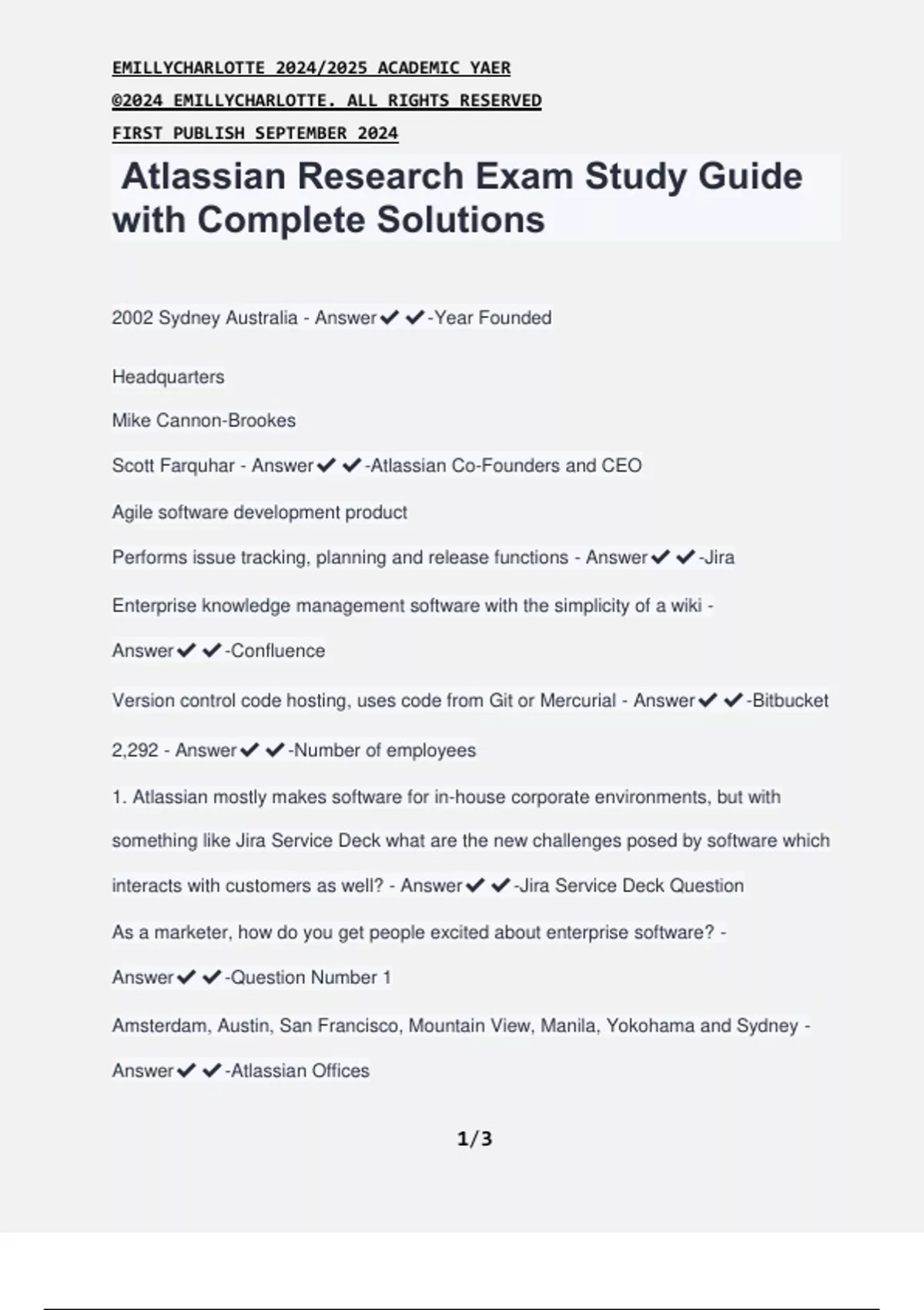 Atlassian Research Exam Study Guide with Complete Solutions 2002 Sydney Australia - Answer-Year Founded Headquarters Mike Cannon-Brookes Scott Farquhar - Answer-Atlassian Co-Founders and CEO Agile software development product Performs issue tracking, planning and release functions - Answer-Jira Enterprise knowledge management software with the simplicity of a wiki - Answer-Confluence Version control code hosting, uses code from Git or Mercurial - Answer-Bitbucket 2,292 - Answer-Number of employees 1. Atlassian mostly makes software for in-house corporate environments, but with something like Jira Service Deck what are the new challenges posed by software which interacts with customers as well? - Answer-Jira Service Deck Question As a marketer, how do you get people excited about enterprise software? - Answer-Question Number 1 Amsterdam, Austin, San Francisco, Mountain View, Manila, Yokohama and Sydney - Answer-Atlassian Offices