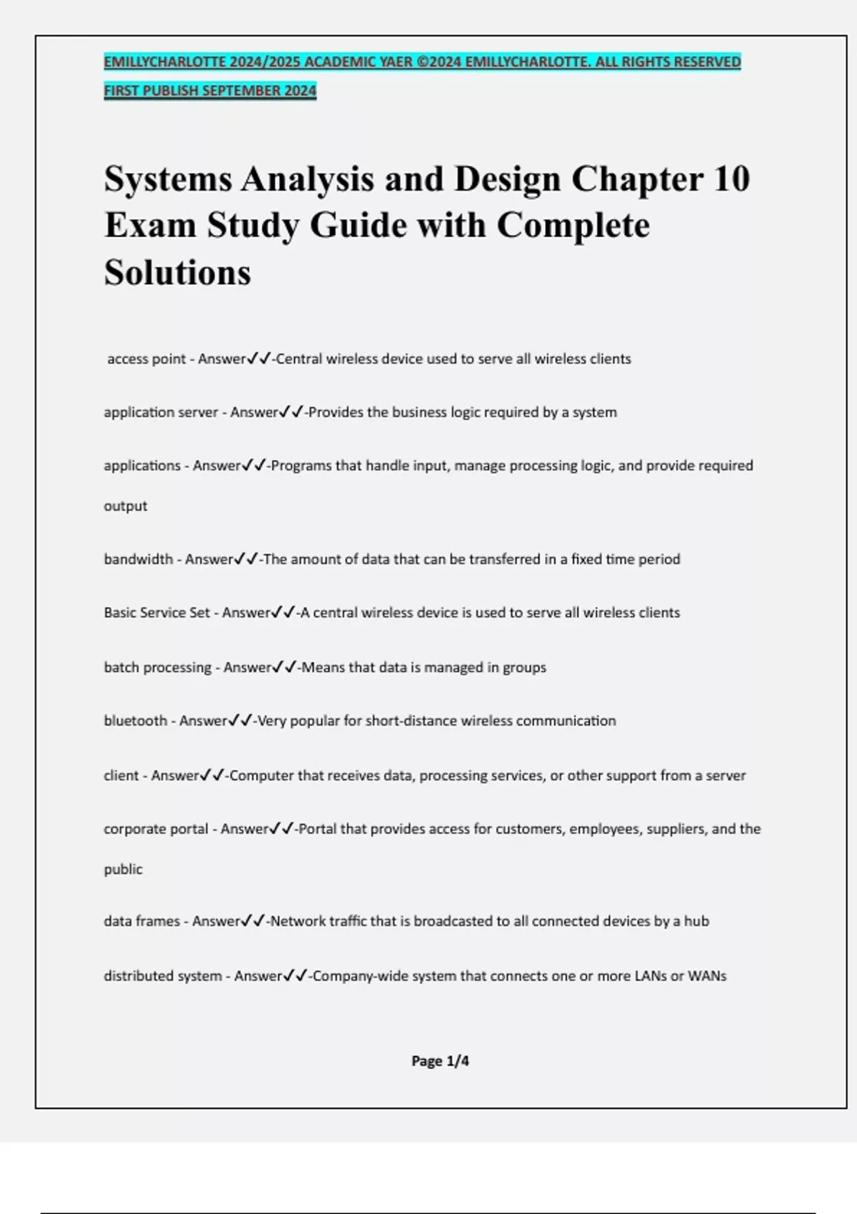 Systems Analysis and Design Chapter 10 Exam Study Guide with Complete Solutions access point - Answer-Central wireless device used to serve all wireless clients application server - Answer-Provides the business logic required by a system applications - Answer-Programs that handle input, manage processing logic, and provide required output bandwidth - Answer-The amount of data that can be transferred in a fixed time period Basic Service Set - Answer-A central wireless device is used to serve all wireless clients batch processing - Answer-Means that data is managed in groups bluetooth - Answer-Very popular for short-distance wireless communication client - Answer-Computer that receives data, processing services, or other support from a server corporate portal - Answer-Portal that provides access for customers, employees, suppliers, and the public data frames - Answer-Network traffic that is broadcasted to all connected devices by a hub distributed system - Answer-Company-wide system that connects one or more LANs or WANs EMILLYCHARLOTTE 2024/2025 ACADEMIC YAER ©2024 EMILLYCHARLOTTE. ALL RIGHTS RESERVED FIRST PUBLISH SEPTEMBER 2024 Page 2/4 Extended Service Set - Answer-Made up of two or more Basic Service Set networks fat client - Answer-Locates all or most of the application processing logic at the client gateway - Answer-Connection between a network topology and a larger, dissimilar network hierarchical network - Answer-Includes one or more powerful servers that control an entire network hub - Answer-Star network connection device that does not perform as well as a switch legacy data - Answer-Data that is difficult to access and transport to client/server environment legacy systems - Answer-Older systems that use outdated technology, but are still functional local area network - Answer-Joins c