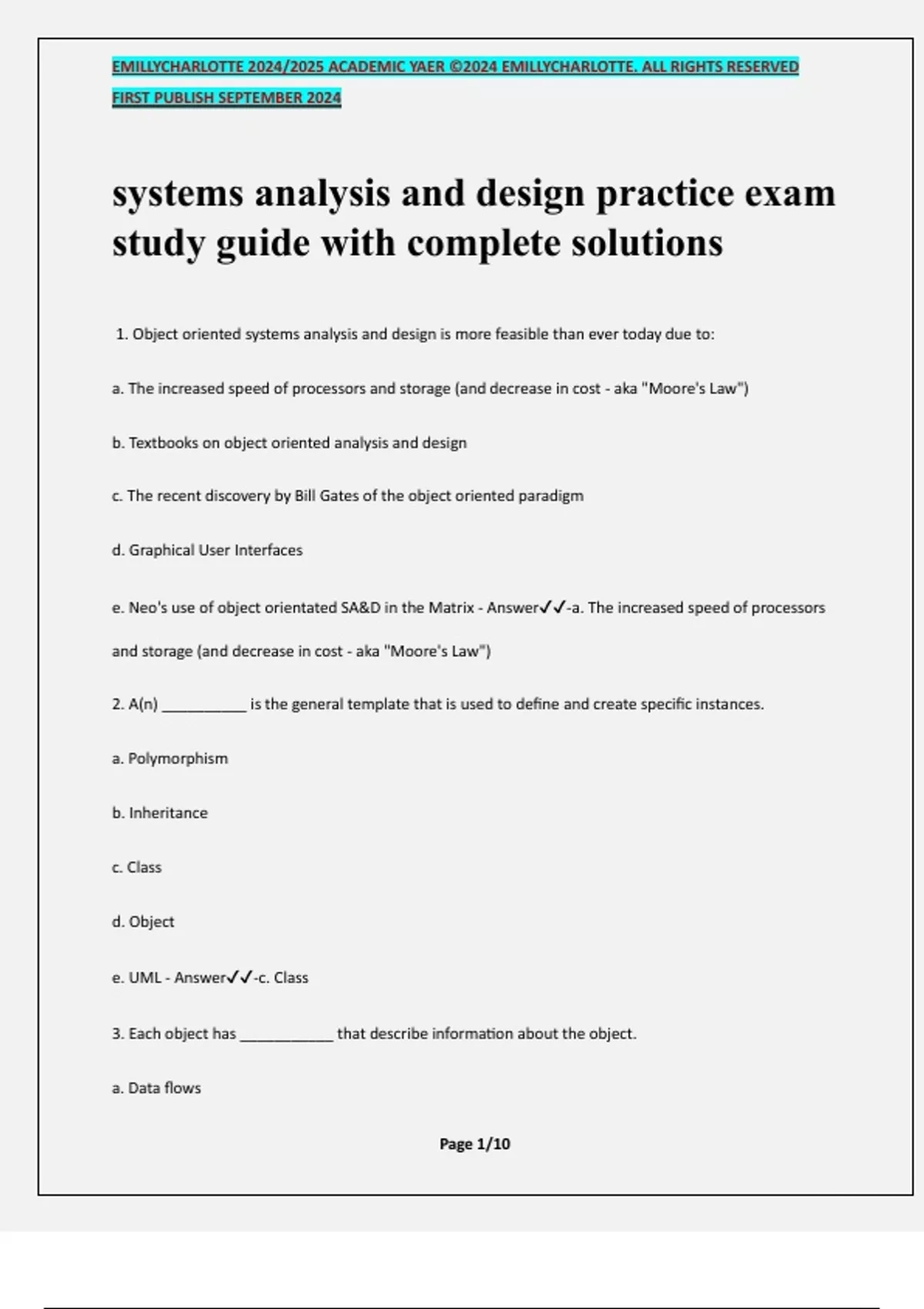 systems analysis and design practice exam study guide with complete solutions 1. Object oriented systems analysis and design is more feasible than ever today due to: a. The increased speed of processors and storage (and decrease in cost - aka "Moore's Law") b. Textbooks on object oriented analysis and design c. The recent discovery by Bill Gates of the object oriented paradigm d. Graphical User Interfaces e. Neo's use of object orientated SA&D in the Matrix - Answer-a. The increased speed of processors and storage (and decrease in cost - aka "Moore's Law") 2. A(n) __________ is the general template that is used to define and create specific instances. a. Polymorphism b. Inheritance c. Class d. Object e. UML - Answer-c. Class 3. Each object has ___________ that describe information about the object. a. Data flows EMILLYCHARLOTTE 2024/2025 ACADEMIC YAER ©2024 EMILLYCHARLOTTE. ALL RIGHTS RESERVED FIRST PUBLISH SEPTEMBER 2024 Page 2/10 b. Data stores c. Entities d. Instances e. Attributes - Answer-e. Attributes 4. Methods implement an object's __________- a. attributes b. behavior c. properties d. size e. screen location - Answer-b. behavior 5. Brett Bradanini and Tim O'Sullivan are 'students'. In this case, 'students' would be considered: a. a concrete class b. an abstract class c. an instance of students d. an aggregate class e. an attribute of Brett and Tim - Answer-a. a concrete class 6. Which is NOT true about the content awareness design principle? a. A date of 8/6/09 will be understood internationally EMILLYCHARLOTTE 2024/2025 ACADEMIC YAER ©2024 EMILLYCHARLOTTE. ALL RIGHTS RESERVED FIRST PUBLISH SEPTEMBER 2024 Page 3/10 b. Drawing boxes around related items (like name / address / city / state / zip) will help users c. Field labels should be fairly short, yet with long enough so that users can not be confused d. Input fields should follow a logical progression that is familiar to users e. All printed forms should have version numbers for better control - Answer-a. A date of 8/6/09 will be understood internationally 7. Some systems that are used infrequently (like decision support systems) should probably emphasize: a. Ease of learning b. Higher user flexibility c. Ease of use d. More short-cut keys and built in keyboard functions e. Organizational feasibility - Answer-a. Ease of learning 8. Typically, the first step in the user interface design process is: a. Design interface standards b. Creating an interface design prototype c. Do an interface evaluation d. Examine DFDs and use cases to develop use scenarios e. Develop the interface structure diagram (ISD) - Answer-d. Examine DFDs and use cases to develop use scenarios EMILLYCHARLOTTE 2024/2025 ACADEMIC YAER ©2024 EMILLYCHARLOTTE. ALL RIGHTS RESERVED FIRST PUBLISH SEPTEMBER 2024 Page 4/10 9. A use scenario is one commonly used ________________. a. Path through a use case b. Normalized ERD structure c. Context diagram d. Buy-in flowchart e. Throwaway prototyping tool - Answer-a. Path through a use case 10. A ___________ is used when fields are numeric or contain coded data. a. Completeness check b. Format check c. Range check d. Check digit check e. Consistency check - Answer-b. Format check 11. During the implementation phase of the SDLC: