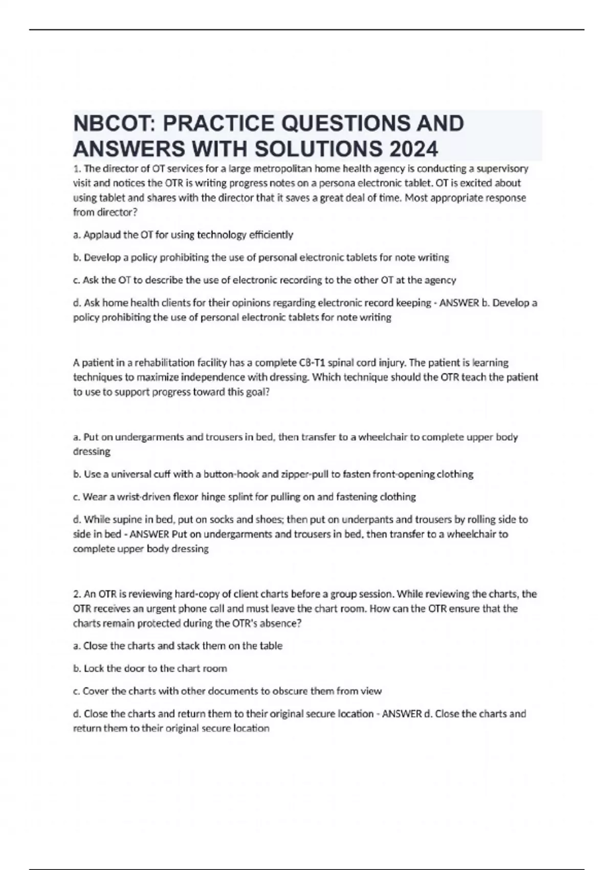NBCOT: PRACTICE QUESTIONS AND ANSWERS WITH SOLUTIONS 2024