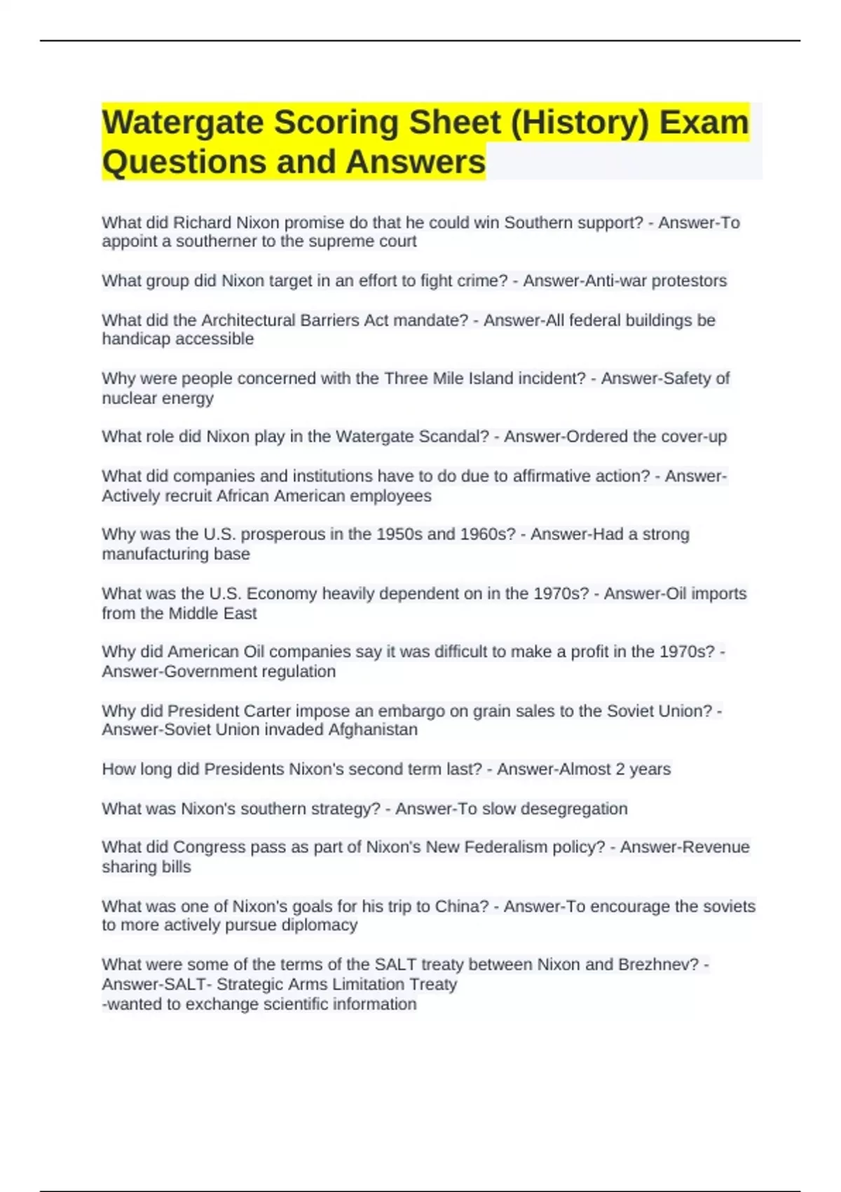 Watergate Scoring Sheet (History) Exam Questions and Answers