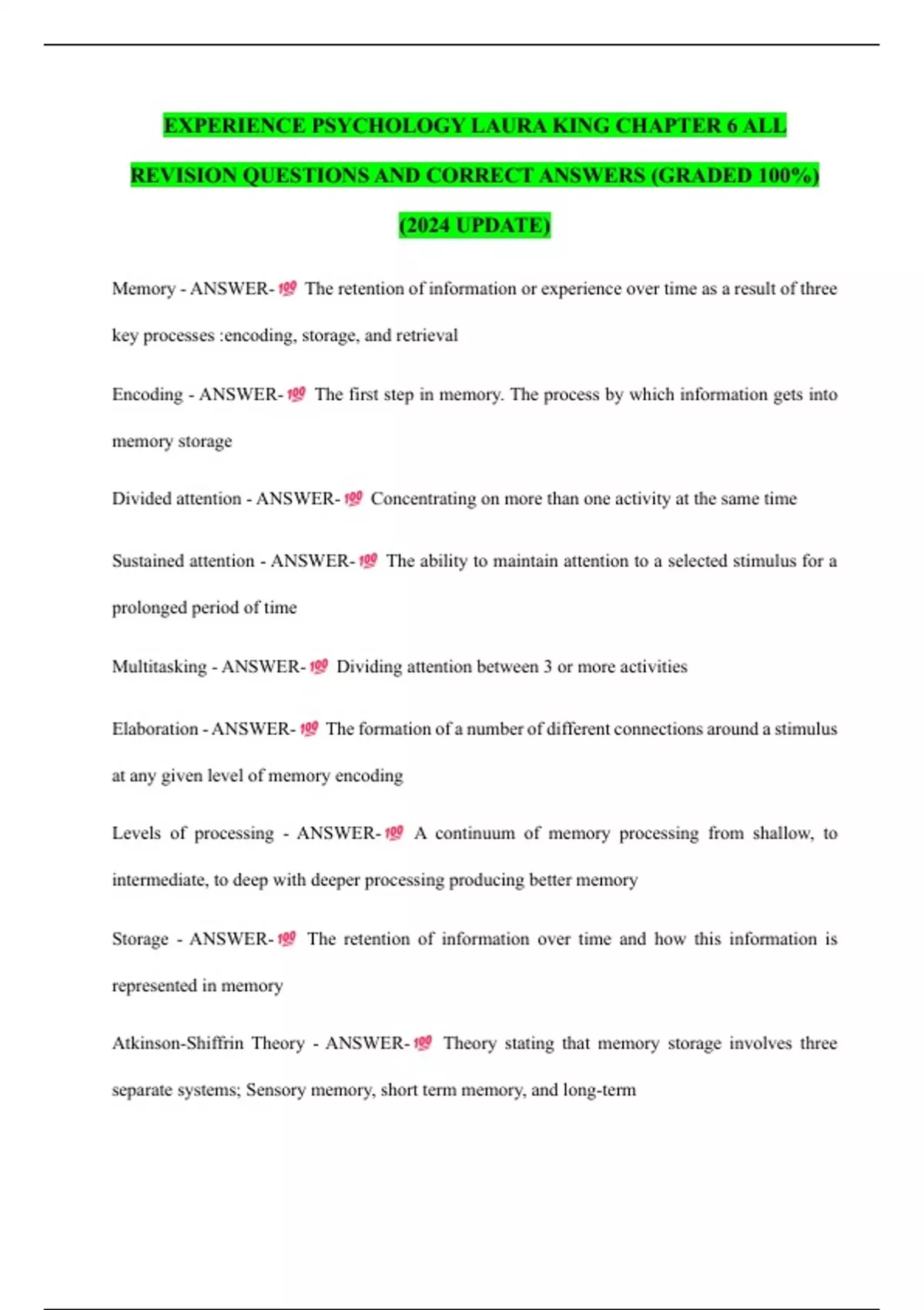 Memory - ANSWER- The retention of information or experience over time as a result of three