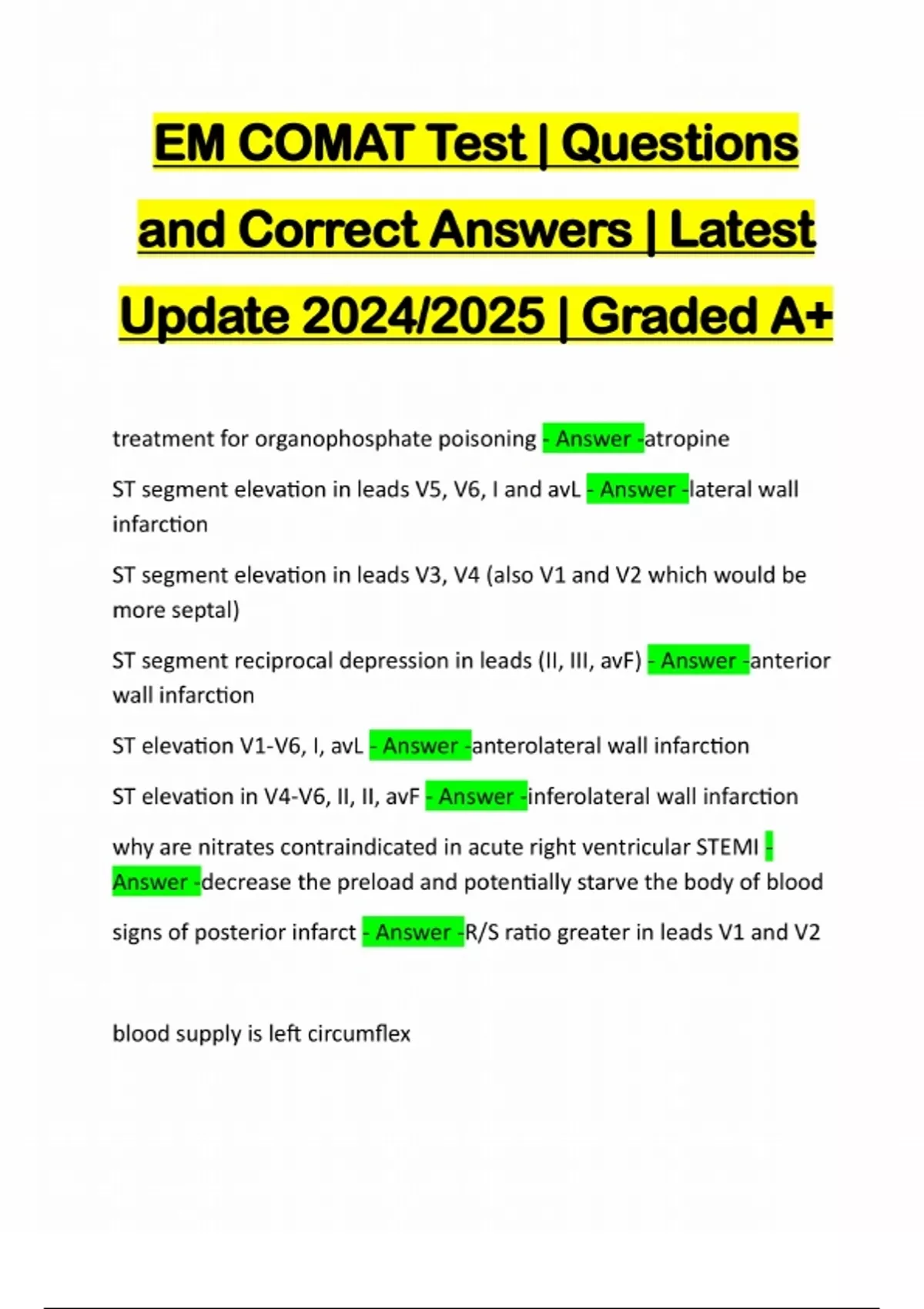 EM COMAT Test | Questions and Correct Answers | Latest Update 2024/2025 | Graded A+ treatment for organophosphate poisoning - Answer -atropine ST segment elevation in leads V5, V6, I and avL - Answer -lateral wall infarction ST segment elevation in leads V3, V4 (also V1 and V2 which would be more septal) ST segment reciprocal depression in leads (II, III, avF) - Answer -anterior wall infarction ST elevation V1-V6, I, avL - Answer -anterolateral wall infarction ST elevation in V4-V6, II, II, avF - Answer -inferolateral wall infarction why are nitrates contraindicated in acute right ventricular STEMI - Answer -decrease the preload and potentially starve the body of blood signs of posterior infarct - Answer -R/S ratio greater in leads V1 and V2 blood supply is left circumflextx this one with MONA Where is the infarction if ST segments are elevated in II, III, aVF with reciprocal ST segment depression in (V1-V3) - Answer -right inferior (ventricular) wall ST segment elevation in V3 and V4...what type of infarct - Answer - anterior TIMI risk
