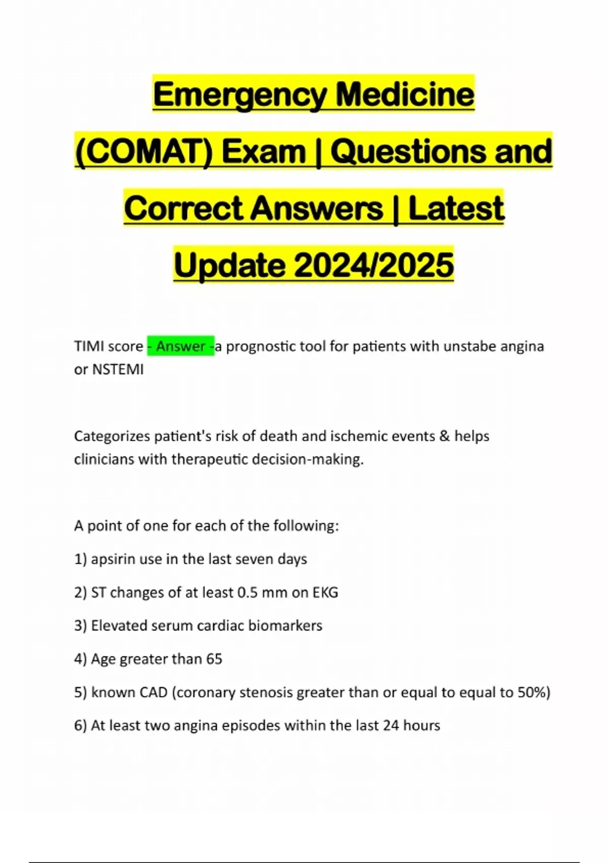 Emergency Medicine (COMAT) Exam | Questions and Correct Answers | Latest Update 2024/2025 TIMI score - Answer -a prognostic tool for patients with unstabe angina or NSTEMI Categorizes patient's risk of death and ischemic events & helps clinicians with therapeutic decision-making. A point of one for each of the following: 1) apsirin use in the last seven days 2) ST changes of at least 0.5 mm on EKG 3) Elevated serum cardiac biomarkers 4) Age greater than 65 5) known CAD (coronary stenosis greater than or equal to equal to 50%) 6) At least two angina episodes within the last 24 hours7) At least three risk factors for CAD such as: HTN, DM, current cigarette smoker, family hx of premature CAD (CAD in male first-degree relative or father less than 55, or female first-degree relative or mother less than 65) most common complication associated with giving pediatric patients succinylcholine - Answer -Rhabdomyolysis with ass