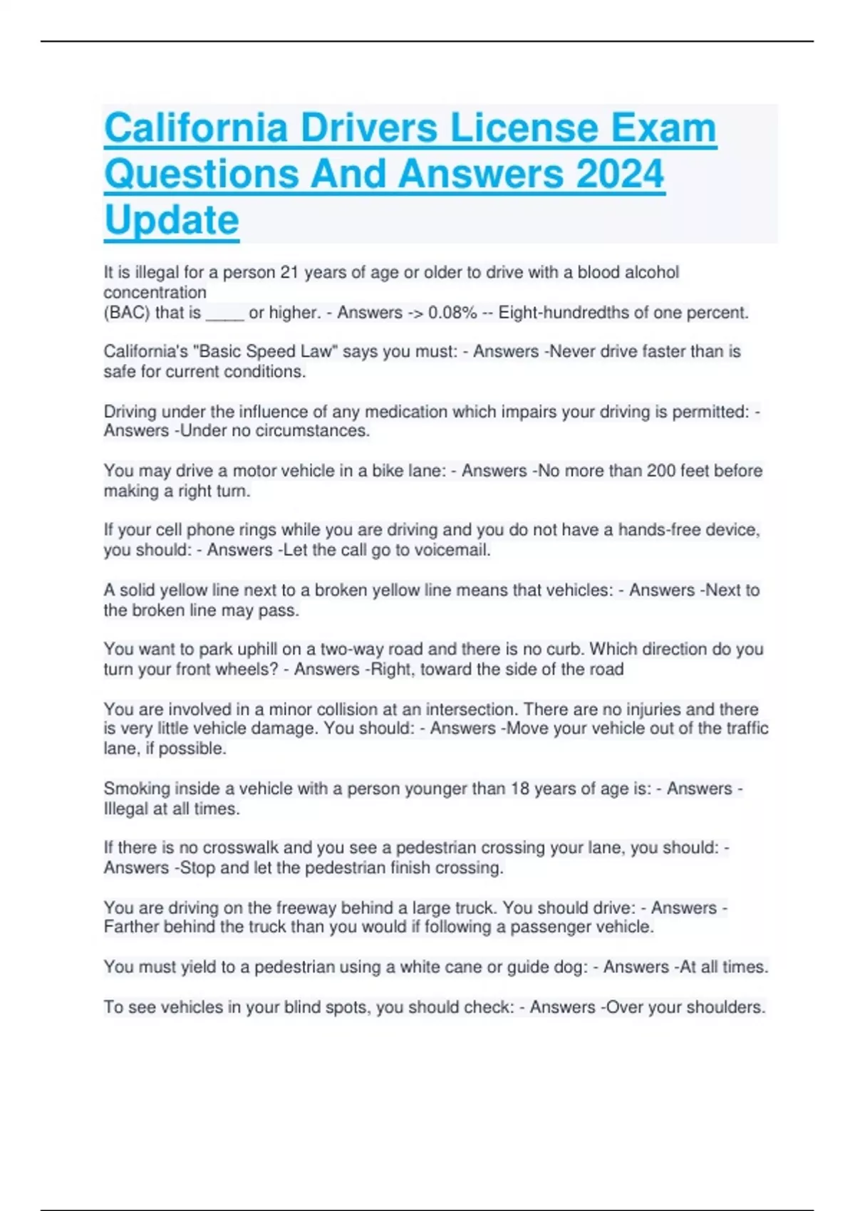 California Drivers License Exam Questions And Answers 2024 Update It is illegal for a person 21 years of age or older to drive with a blood alcohol concentration (BAC) that is ____ or higher. - Answers - 0.08% -- Eight-hundredths of one percent. California's "Basic Speed Law" says you must: - Answers -Never drive faster than is safe for current conditions. Driving under the influence of any medication which impairs your driving is permitted: - Answers -Under no circumstances. You may drive a motor vehicle in a bike lane: - Answers -No more than 200 feet before making a right turn. If your cell phone rings while you are driving and you do not have a hands-free device, you should: - Answers -Let the call go to voicemail. A solid yellow line next to a broken yellow line means that vehicles: - Answers -Next to the broken line may pass. You want to park uphill on a two-way road and there is no curb. Which direction do you turn your front wheels? - Answers -Right, toward the side of the road You are involved in a minor collision at an intersection. There are no injuries and there is very little vehicle damage. You should: - Answers -Move your vehicle out of the traffic lane, if possible. Smoking inside a vehicle with a person younger than 18 years of age is: - Answers -Illegal at all times. If there is no crosswalk and you see a pedestrian crossing your lane, you should: - Answers -Stop and let the pedestrian finish crossing. You are driving on the freeway behind a large truck. You should drive: - Answers -Farther behind the truck than you would if following a passenger vehicle. You must yield to a pedestrian using a white cane or guide dog: - Answers -At all times. To see vehicles in your blind spots, you should check: - Answers -Over your shoulders. You are on the freeway and traffic is merging into your lane. You should: - Answers -Make room for the merging traffic, if possible. If a traffic signal light is not working, you must: - Answers -Stop, then proceed when safe. Extra space in front of a large truck is needed for: - Answers -The truck driver to stop the vehicle. When passing another vehicle, it is safe to return to your lane if you: - Answers -See the vehicle's headlights in your rearview mirror. You consent to take a chemical test for the alcohol content of your blood, breath, or urine: - Answers -Whenever you drive in California. When driving at night on a dimly lit street, you should: - Answers -Drive slowly enough that you can stop within the area illuminated by your headlights. You may drive off of the paved roadway to pass another vehicle: - Answers -Under no circumstances. You are approaching a railroad crossing with no warning devices and are unable to see 400 feet down the tracks in one direction. The speed limit is: - Answers -15 mph. When parking your vehicle parallel to the curb on a level street: - Answers -Your wheels must be within 18 inches of the curb. When you are merging onto the freeway, you should be driving: - Answers -At or near the speed of traffic on the freeway. To avoid last-minute moves, you should be looking down the road to where your vehicle will be in about: - Answers -10 to 15 seconds. You should signal at least how many feet before you turn? - Answers -100Unless otherwise posted, the speed limit in a residential area is: