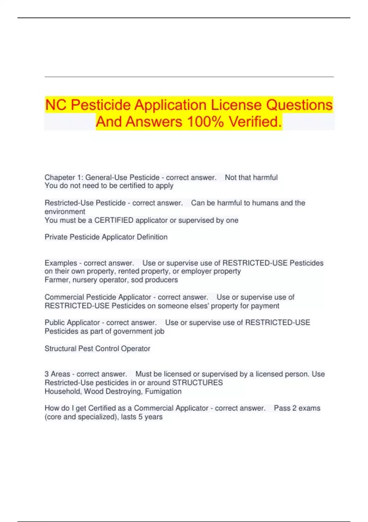 NC Pesticide Application License Questions And Answers 100% Verified. Chapeter 1: General-Use Pesticide - correct answer. Not that harmful You do not need to be certified to apply Restricted-Use Pesticide - correct answer. Can be harmful to humans and the environment You must be a CERTIFIED applicator or supervised by one Private Pesticide Applicator Definition Examples - correct answer. Use or supervise use of RESTRICTED-USE Pesticides on their own property, rented property, or employer property Farmer, nursery operator, sod producers Commercial Pesticide Applicator - correct answer. Use or supervise use of RESTRICTED-USE Pesticides on someone elses' property for payment Public Applicator - correct answer. Use or supervise use of RESTRICTED-USE Pesticides as part of government job Structural Pest Control Operator 3 Areas - correct answer. Must be licensed or supervised by a licensed person. Use Restricted-Use pesticides in or around STRUCTURES Household, Wood Destroying, Fumigation How do I get Certified as a Commercial Applicator - correct answer. Pass 2 exams (core and specialized), lasts 5 years How do I get Re-Certified as a Commercial Applicator - correct answer. Earn the required hours of Continuing Education or Take and Pass the exams again How do I get Licensed as a Commercial Applicator - correct answer. Pass both core and specialty exam and earn License - Must renew at the end of each year How do I get Certified as a Structural Pesticide Applicator - correct answer. Pass Core exam and an exam in each of the 3 phases (household, wood destroying, fumigation) How do I get Re-Certified as a Structural Pesticide Applicator - correct answer. Complete needed continuing education or re-take and pass exams How do I get Licensed as a Structural Pesticide Applicator - correct answer. Be certified in the area, have 2 year's of experience How long does a Structural Pest Control License last? - correct answer. 5 years What are the Categories of Licensing for Certification as a Commercial Applicator - correct answer. Registered Technician Non-Commercial Certified Applicator Commercial Certified Applicator License Can Structural Pest Control Applicators Work for Hire on their own? - correct answer. They have to work for a licensed pest control company Chapter 2: Federal Insecticide, Fungicide, and Rodenticide (FIFRA) Act - correct answer. Ruled by the Environmental Protection Agency (EPA) Register products based on possible effects to people and the environment What is important about a Pesticide Label - correct answer. People who don't follow it are BREAKING THE LAW What does the EPA do? - correct answer. Re-evaluate older pesticides Review every pesticide on a 15 year cycle Establish safety rules for workers What can STATES do to regulate pesticides? - correct answer. They must follow EPA guidelines at a minimum They can make even harder guidelines Is there a special ACT that relates to food and feed products? - correct answer. Federal Food, Drug, and Cosmetic Act established tolerance levels for food - how much residue of a pesticide is allowed Food Quality Protection Act - correct answer. Requires the EPA to establish a tolerance low enough that no harm can come to humans or environment Hazard Communication Standards Act - correct answer. Requires employers to list all hazardous chemicals in the workplace, obtain material safety data on each one, ensure containers are labeled, train workers how to deal with materials NC Pesticide Law if 1971 - correct answer. established management program designed to regulate the registration, handling, storage and disposal of pesticides manage licensing for all pesticide users (EXCEPT Structural - they are handled by another law) How should you STORE pesticides? - correct answer. Tightly sealed labeled dry Not around food Not around combustible (FIRE Causing) materials What does the NC Pesticide Board do? - correct answer. Adopts regulations that detail acceptable pesticide use and licensing What is a VERTEBRATE? - correct answer. An animal with jointed backbones - mammals, birds, reptiles, amphibians, fish Can a VERTEBRATE be a PEST? - correct answer. Yes if it brings injury to plants, humans, domestic animals, or substances If the Pesticide Board thinks a vertebrate is a pest what do they do? - correct answer. Contact Wildlife resources - but if they disagree, no pesticide can be used Vertebrate Pests that it is OK to use pesticides on - correct answer. black or roof rat, Norway rat, pine vole, house mouse, boat-tailed grackle, pigeon, brown-headed cowbird, common grackle, English sparrow, red-wing and common black bird, gulls, starling List the 4 Main Groups of Pests - correct answer. Weeds Inveterbrates (insects) Disease Agents or pathogens (bacteria, fungus) Vertebrates (rodents. birds) Chapter 3: 3 Pest Management Goals - correct answer. Prevention - keep it from happening Suppression - reduce levels Eradication - eliminate totally