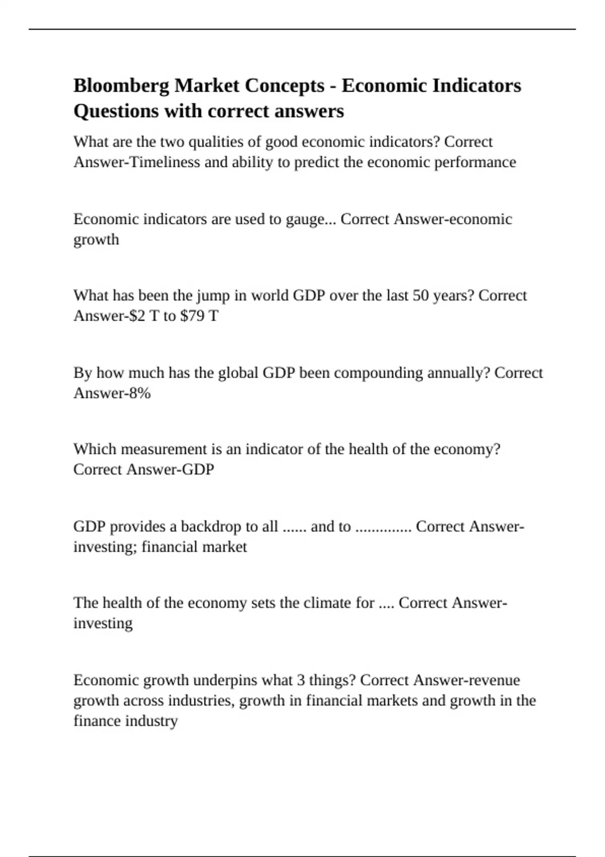 Bloomberg Market Concepts - Economic Indicators Questions with correct answers