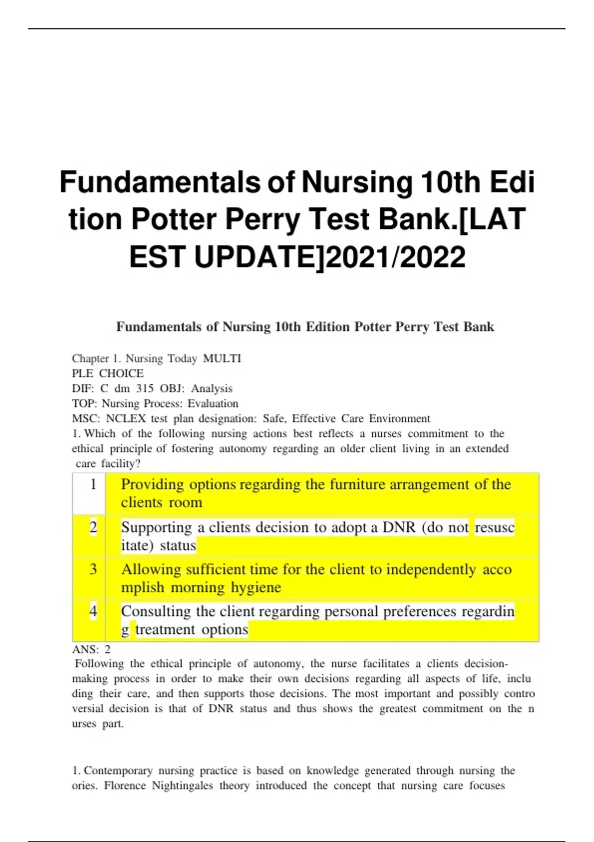 Fundamentals of Nursing 10th Edition Potter Perry Test Bank