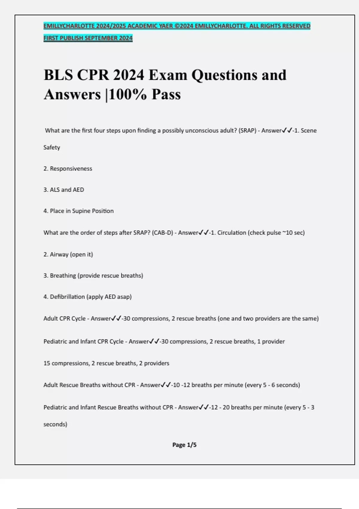 BLS CPR 2024 Exam Questions and Answers |100% Pass What are the first four steps upon finding a possibly unconscious adult? (SRAP) - Answer-1. Scene Safety 2. Responsiveness 3. ALS and AED 4. Place in Supine Position What are the order of steps after SRAP? (CAB-D) - Answer-1. Circulation (check pulse ~10 sec) 2. Airway (open it) 3. Breathing (provide rescue breaths) 4. Defibrillation (apply AED asap) Adult CPR Cycle - Answer-30 compressions, 2 rescue breaths (one and two providers are the same) Pediatric and Infant CPR Cycle - Answer-30 compressions, 2 rescue breaths, 1 provider 15 compressions, 2 rescue breaths, 2 providers Adult Rescue Breaths without CPR - Answer-10 -12 breaths per minute (every 5 - 6 seconds) Pediatric and Infant Rescue Breaths without CPR - Answer-12 - 20 breaths per minute (every 5 - 3 seconds) EMILLYCHARLOTTE 2024/2025 ACADEMIC YAER ©2024 EMILLYCHARLOTTE. ALL RIGHTS RESERVED FIRST PUBLISH SEPTEMBER 2024 Page 2/5 How do you open the airway if collapse was unwitnessed or you suspect c-spine precaution is needed? - Answer-Jaw-Thrust Maneuver How do you open the airway if you saw the collapse and do not suspect c-spine precautions are needed? - Answer-Head-Tilt Chin Lift When do you perform CPR? - Answer-When patient is unconscious, apneic, and pulseless When do you stop CPR? - Answer-- Clear signs of death (cold and stiff) - Clear signs of life (breathing, movement, ROSC) - Scene safety is jeopardized or you are physically incapable of continuing due to one-provider fatigue - ALS has arrived Approximately how many minutes is 5 cycles of CPR? - Answer-2 minutes What should you do after 5 cycles of CPR? - Answer-Switch positions if two-provider and reassess pulse You are with a partner. You've confirmed your adult patient is unresponsive, what are you next steps to determine your course of action? - Answer-Partner or bystander calls for ALS and AED. Meanwhile, you place the patient supine. Check pulse and breathing. You are alone. You've confirmed your adult patient is unresponsive, what are you next steps to determine your course of action? - Answer-You first call for ALS and AED. Place supine. Check pulse and breathing. EMILLYCHARLOTTE 2024/2025 ACADEMIC YAER ©2024 EMILLYCHARLOTTE. ALL RIGHTS RESERVED FIRST PUBLISH SEPTEMBER 2024 Page 3/5 You are with a partner. You've confirmed the infant is pulseless and apneic. - Answer-Partner or bystander calls for ALS and AED. Meanwhile, you place the patient supine. Begin CPR (15:2) You are alone and did not witness the collapse of an infant patient. You've confirmed the infant is pulseless and apneic. - Answer-First, perform 2 minutes of CPR (30:2) in a supine position. Then call for ALS and AED. You are alone and did witness the collapse of an infant patient. You've confirmed the infant is pulseless and apneic. - Answer-First, call for ALS and AED. Then perform CPR (30:2) in a supine position. Infant Chest Compressions (One Provider) - Answer-Two fingers on the sternum, starting at the nipple line 1.5in or 1/3 chest depth 100 - 120 compressions per minute 30:2 compressions to breaths Infant Chest Compressions (Two Providers) - Answer