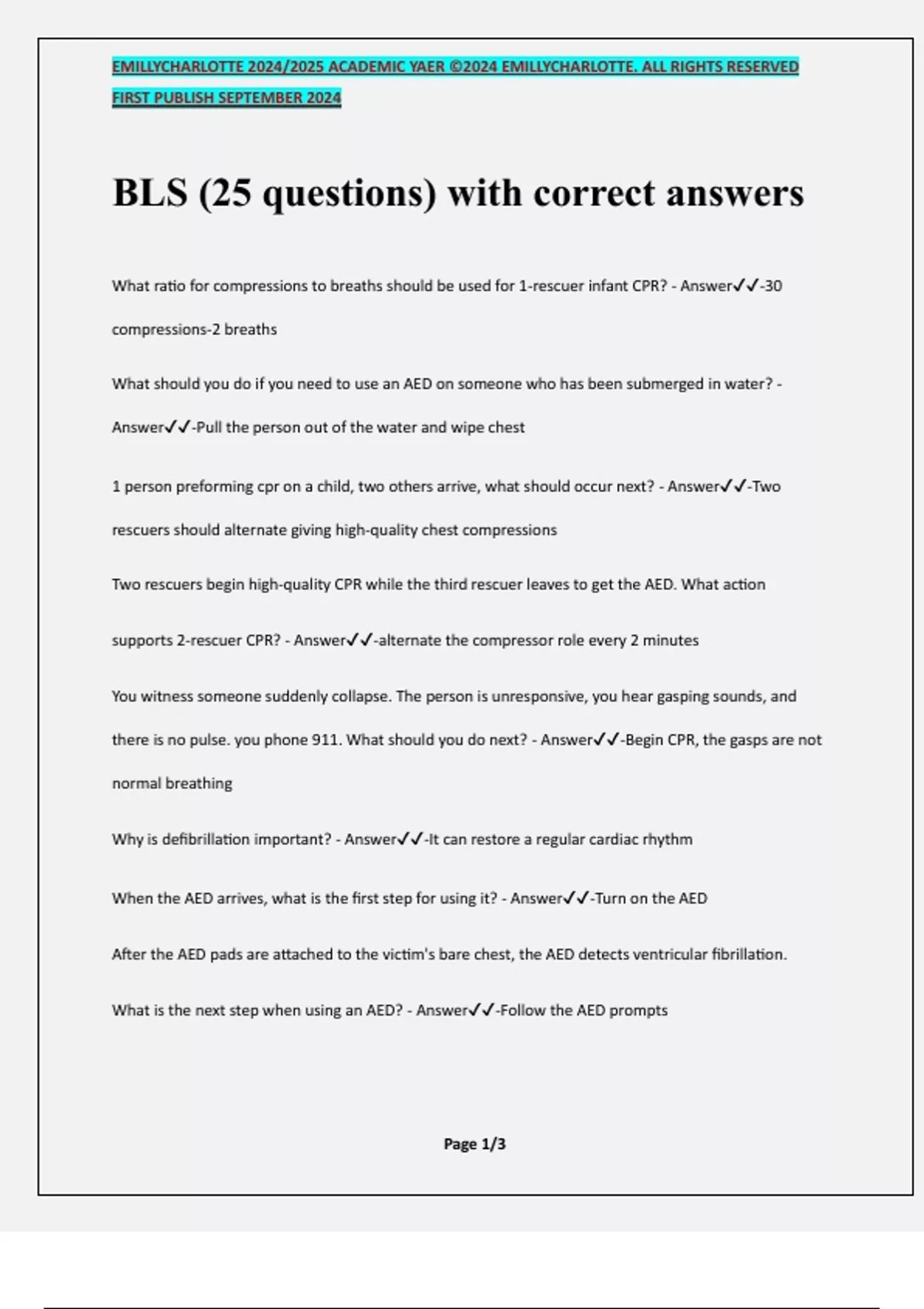 BLS (25 questions) with correct answers What ratio for compressions to breaths should be used for 1-rescuer infant CPR? - Answer-30 compressions-2 breaths What should you do if you need to use an AED on someone who has been submerged in water? - Answer-Pull the person out of the water and wipe chest 1 person preforming cpr on a child, two others arrive, what should occur next? - Answer-Two rescuers should alternate giving high-quality chest compressions Two rescuers begin high-quality CPR while the third rescuer leaves to get the AED. What action supports 2-rescuer CPR? - Answer-alternate the compressor role every 2 minutes You witness someone suddenly collapse. The person is unresponsive, you hear gasping sounds, and there is no pulse. you phone 911. What should you do next? - Answer-Begin CPR, the gasps are not normal breathing Why is defibrillation important? - Answer-It can restore a regular cardiac rhythm When the AED arrives, what is the first step for using it? - Answer-Turn on the AED After the AED pads are attached to the victim's bare chest, the AED detects ventricular fibrillation. What is the next step when using an AED? - Answer-Follow the AED prompts