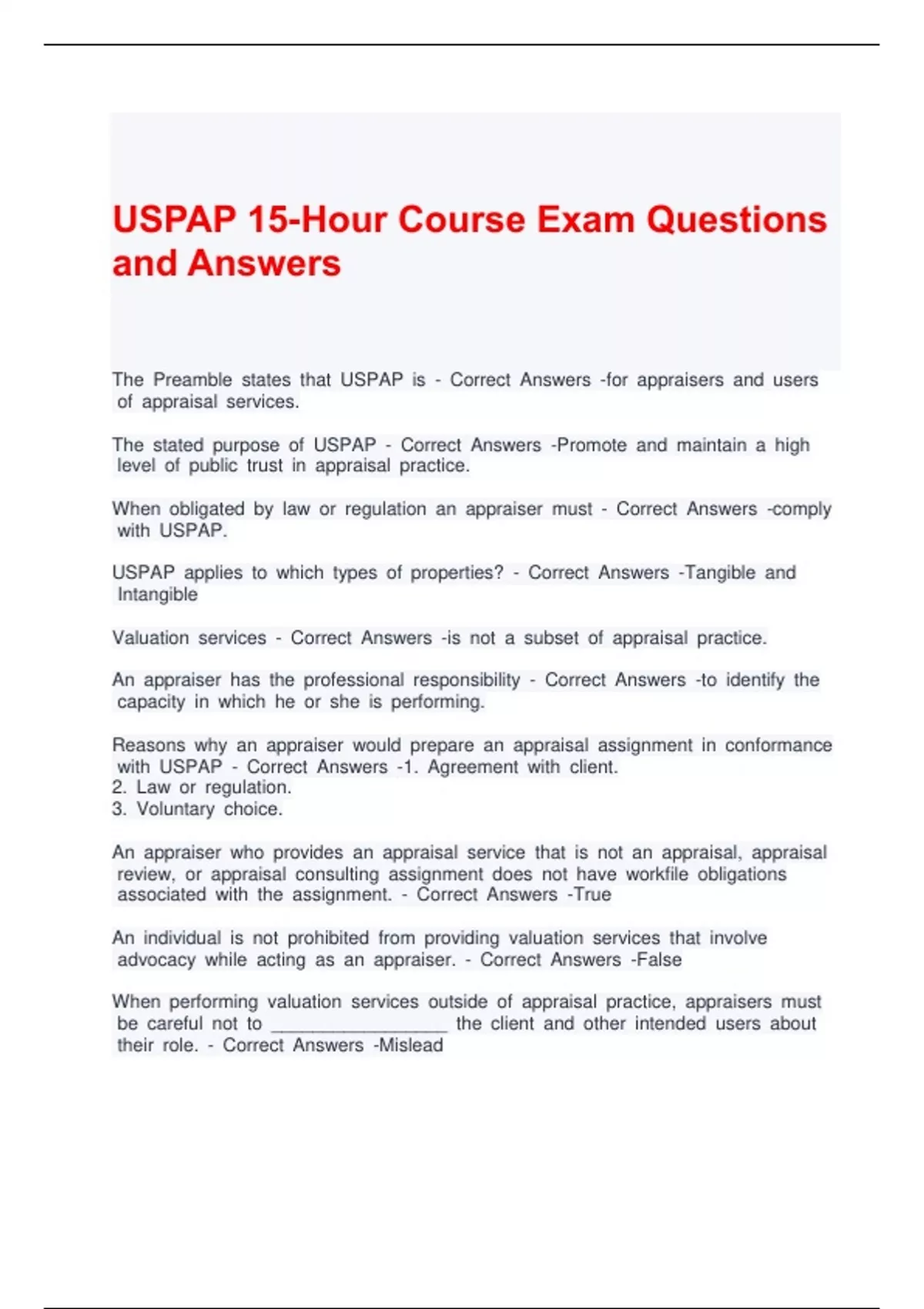 USPAP 15-Hour Course Exam Questions