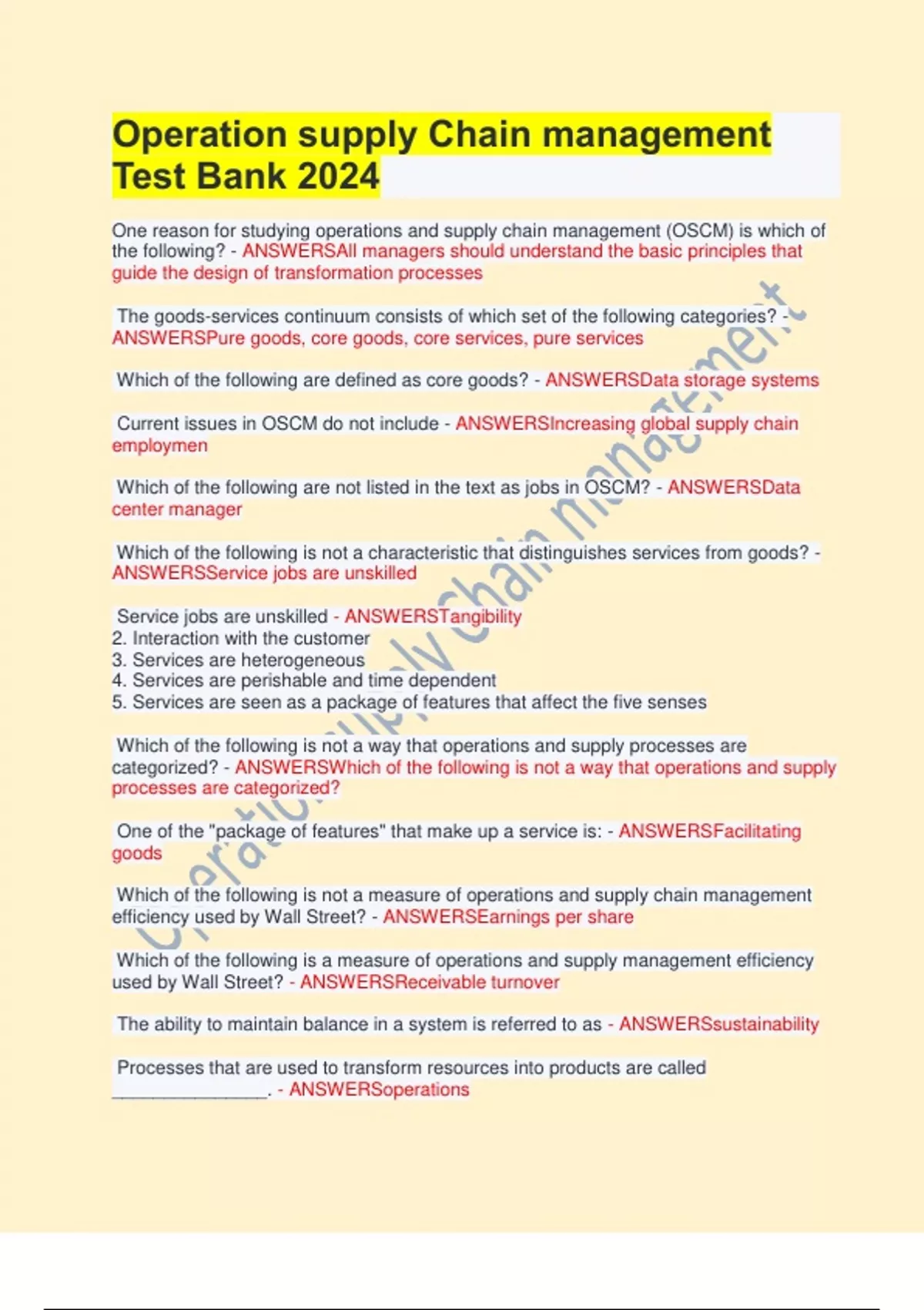 Operation supply Chain management Test Bank 2024 One reason for studying operations and supply chain management (OSCM) is which of the following? - ANSWERSAll managers should understand the basic principles that guide the design of transformation processes The goods-services continuum consists of which set of the following categories? - ANSWERSPure goods, core goods, core services, pure services Which of the following are defined as core goods? - ANSWERSData storage systems Current issues in OSCM do not include - ANSWERSIncreasing global supply chain employmen Which of the following are not listed in the text as jobs in OSCM? - ANSWERSData center manager Which of the following is not a characteristic that distinguishes services from goods? - ANSWERSService jobs are unskilled Service jobs are unskilled - ANSWERSTangibility 2. Interaction with the customer 3. Services are heterogeneous 4. Services are perishable and time dependent 5. Services are seen as a package of features that affect the five senses Which of the following is not a way that operations and supply processes are categorized? - ANSWERSWhich of the following is not a way that operations and supply processes are categorized? One of the "package of features" that make up a service is: - ANSWERSFacilitating goods Which of the following is not a measure of operations and supply chain management efficiency used by Wall Street? - ANSWERSEarnings per share Which of the following is a measure of operations and supply management efficiency used by Wall Street? - ANSWERSReceivable turnover The ability to maintain balance in a system is referred to as - ANSWERSsustainability Processes that are used to transform resources into products are called _______________. - ANSWERSoperations