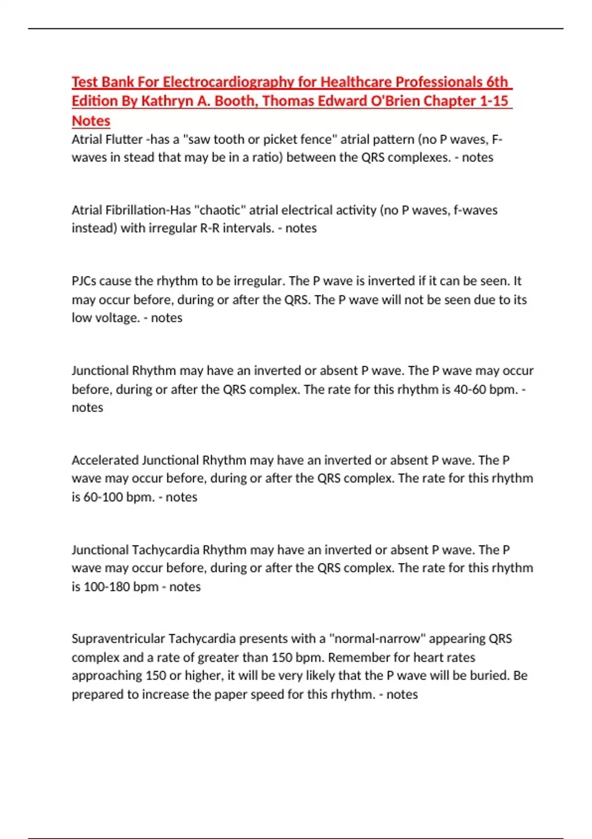 Test Bank For Electrocardiography for Healthcare Professionals 6th Edition By Kathryn A. Booth, Thomas Edward O'Brien Chapter 1-15 Notes Atrial Flutter -has a "saw tooth or picket fence" atrial pattern (no P waves, F-waves in stead that may be in a ratio) between the QRS complexes. - notes Atrial Fibrillation-Has "chaotic" atrial electrical activity (no P waves, f-waves instead) with irregular R-R intervals. - notes PJCs cause the rhythm to be irregular. The P wave is inverted if it can be seen. It may occur before, during or after the QRS. The P wave will not be seen due to its low voltage. - notes Junctional Rhythm may have an inverted or absent P wave. The P wave may occur before, during or after the QRS complex. The rate for this rhythm is 40-60 bpm. - notes Accelerated Junctional Rhythm may have an inverted or absent P wave. The P wave may occur before, during or after the QRS complex. The rate for this rhythm is 60-100 bpm. - notes Junctional Tachycardia Rhythm may have an inverted or absent P wave. The P wave may occur before, during or after the QRS complex. The rate for this rhythm is 100-180 bpm - notes Supraventricular Tachycardia presents with a "normal-narrow" appearing QRS complex and a rate of greater than 150 bpm. Remember for heart rates approaching 150 or higher, it will be very likely that the P wave will be buried. Be prepared to increase the paper speed for this rhythm. - notes First Degree AV Block, the PR interval is constant and measures greater than 0.20 second. - notes Second Degree AV Blocok Mobitz I (Wenkebach) has a cyclical prolonging PR interval until the QRS is dropped. Then the cycle begins again. ***Remember the clue "lengthen, lengthen drop Wenkebach. - notes Second Degree (AV) Block has a constant PR interval with blocked QRS complexes - notes