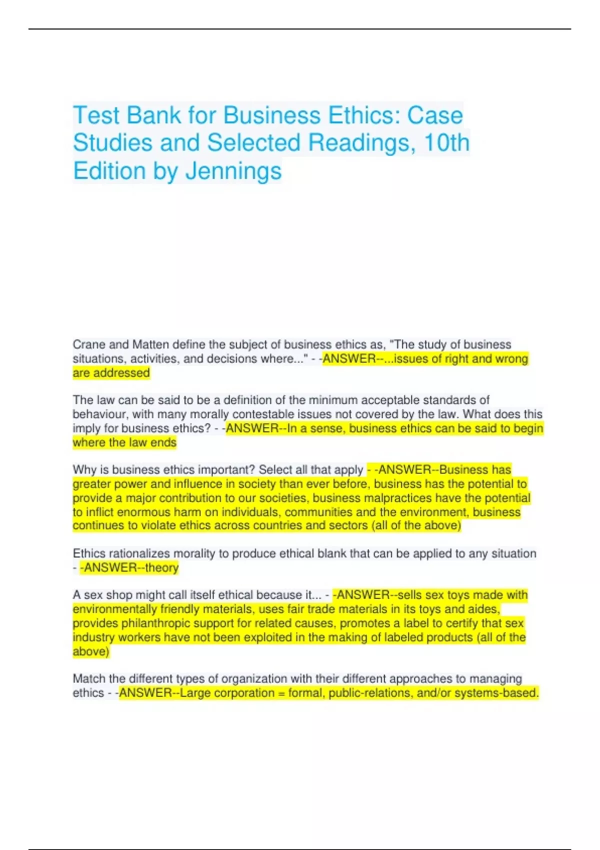 Test Bank for Business Ethics: Case Studies and Selected Readings, 10th Edition by Jennings