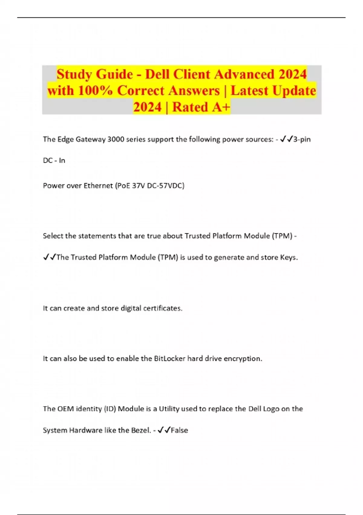 Study Guide - Dell Client Advanced 2024 with 100% Correct Answers | Latest Update 2024 | Rated A+