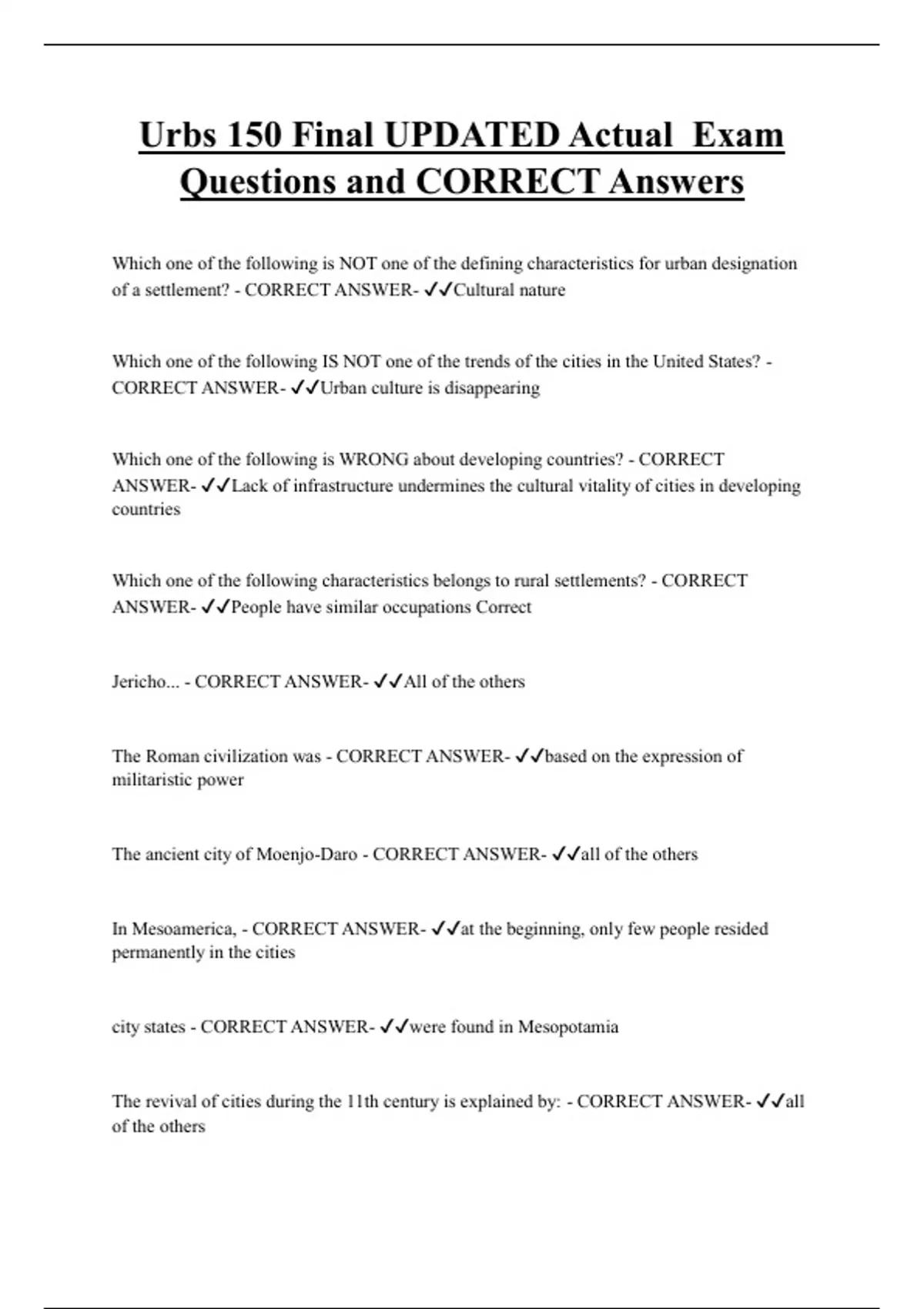 CORRECT ANSWER- ✔✔Urban culture is disappearing