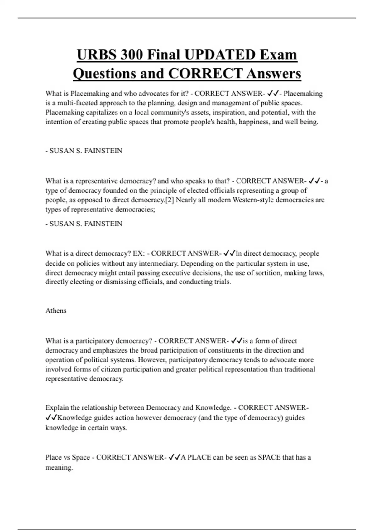 URBS 300 Final UPDATED Exam Questions and CORRECT Answers What is Placemaking and who advocates for it? - CORRECT ANSWER- - Placemaking is a multi-faceted approach to the planning, design and management of public spaces. Placemaking capitalizes on a local community's assets, inspiration, and potential, with the intention of creating public spaces that promote people's health, happiness, and well being. - SUSAN S. FAINSTEIN