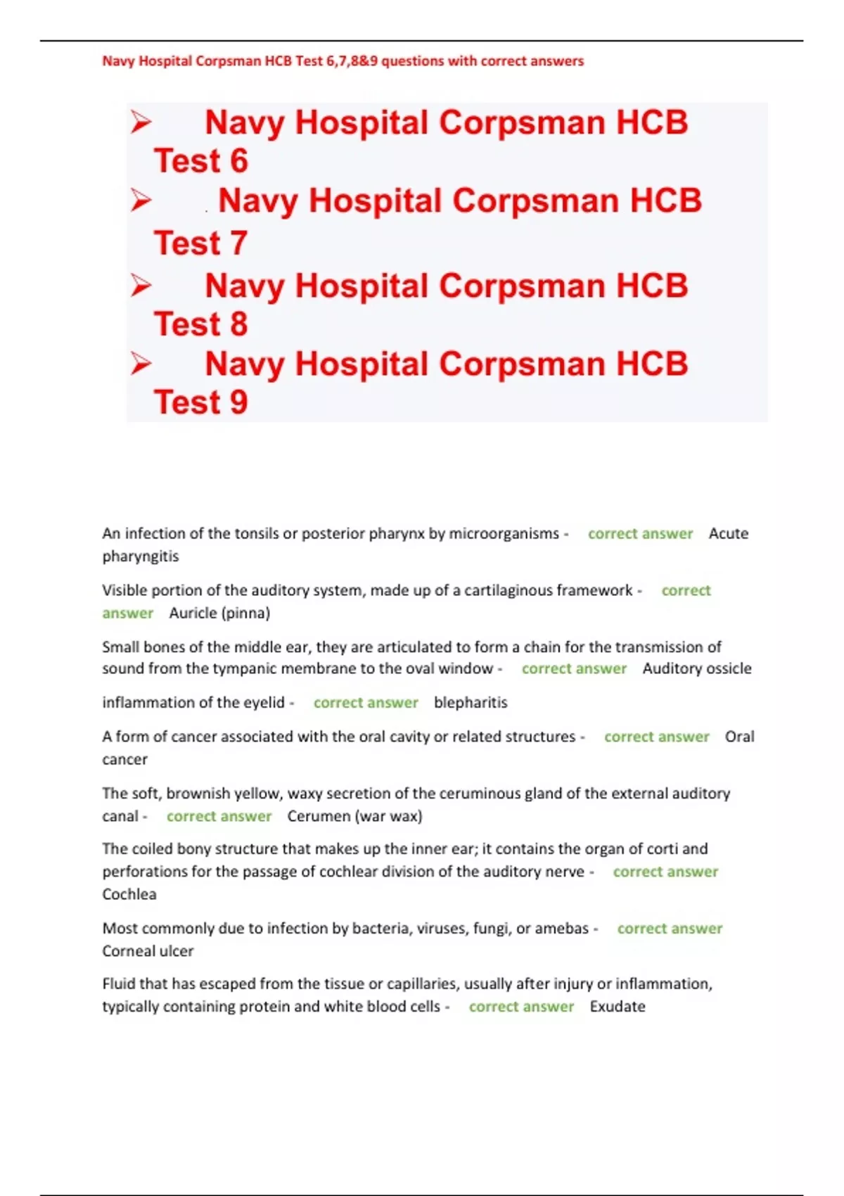 Navy Hospital Corpsman HCB Test 6,7,8&9 questions with correct answers/Navy Hospital Corpsman HCB Test 6,7,8&9 questions with correct answers/Navy Hospital Corpsman HCB Test 6,7,8&9 questions with correct answers