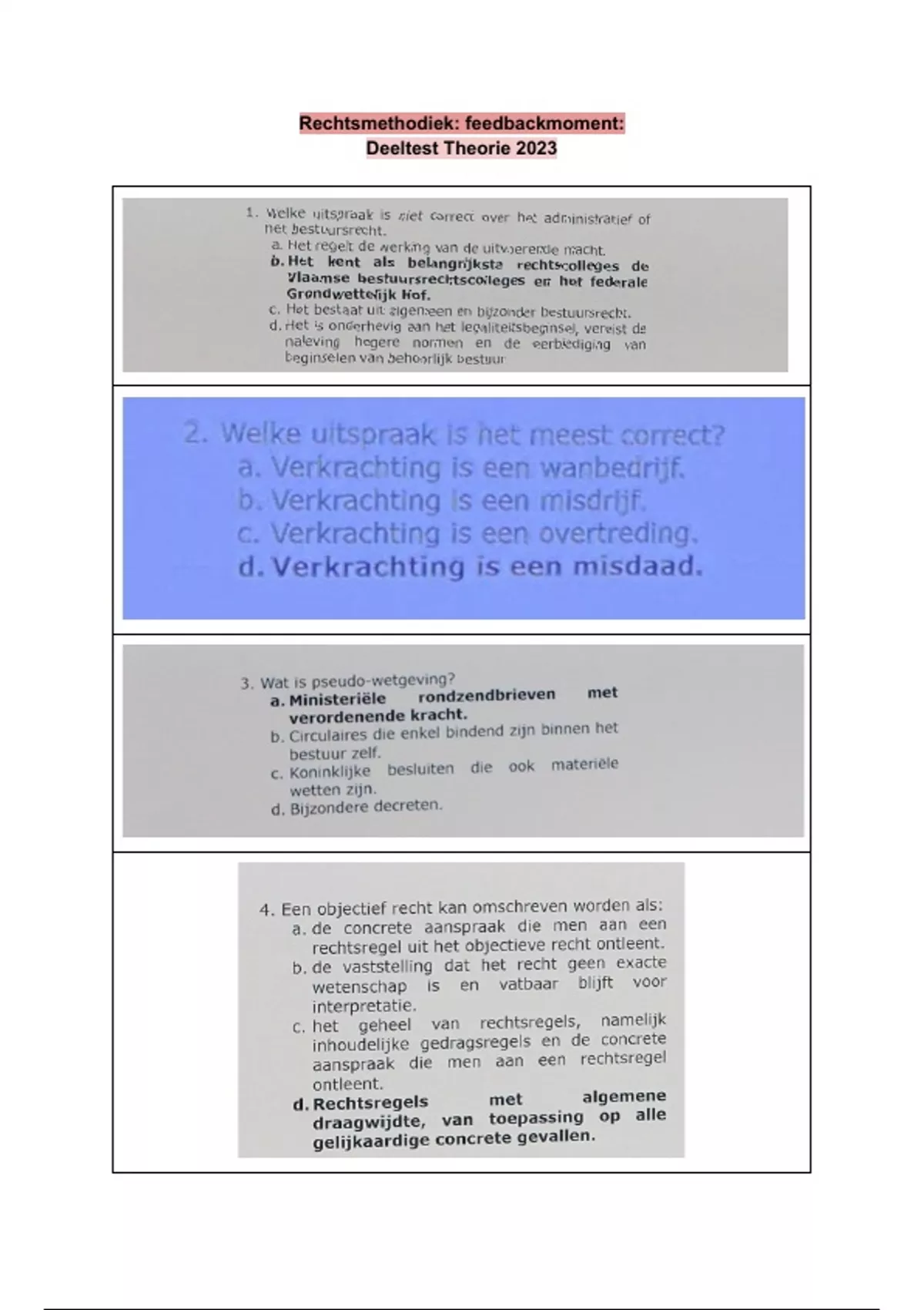In het eerste jaar rechten wordt er getoetst hoe goed je zaken van buiten kan leren op een korte termijn. Desondanks het drukke schema aan lessen doorheen de week zal er aan het begin van het jaar een deeltest theorie plaatsvinden voor het vak rechtsmethodiek. Als je tezamen met de verhoogde cesuur een voldoende haalt kan je hiermee 20% van je punten voor het examen scoren! Deze 20% kan het beslissende punt zijn! Dit document zal je dan ook inzicht geven in wat voor vragen ze zullen stellen, maw. heel handig om tijdens het studeren te gebruiken. Het is dus zeker een goede investering in goede punten voor het vak. Het document bevat alle vragen die vorig jaar werden gesteld. Veel succes! Ps. Het document bevat alle 30 de vragen + het juiste antwoord.