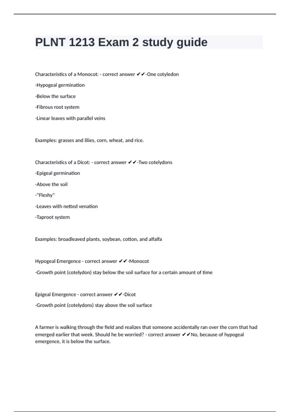 Characteristics of a Monocot: - correct answer ✔✔-One cotyledon